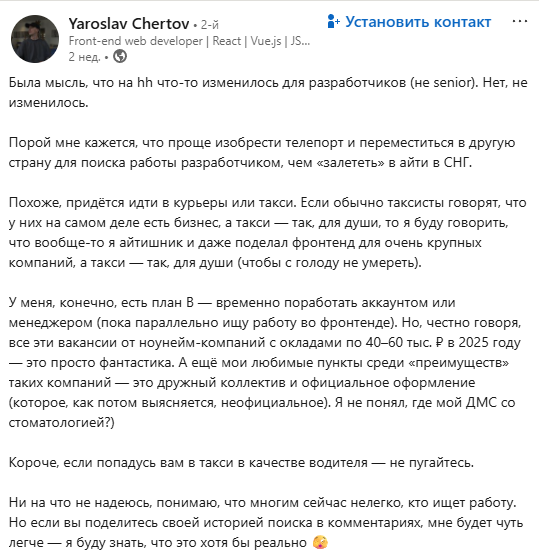 >>3556814 Кстати да. Я тоже неиронично подумываю перекатиться. В моем стеке (бек на сишарпе и голенге) разрабы стремительно превратились в прокладку к чатгпт, особенно это заметно в сишарпе. Низкие требования - толпа кандидатов - твое резюме даже не открыли и похуй на 10 лет опыта.