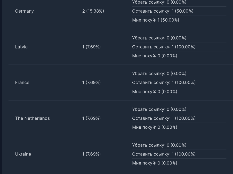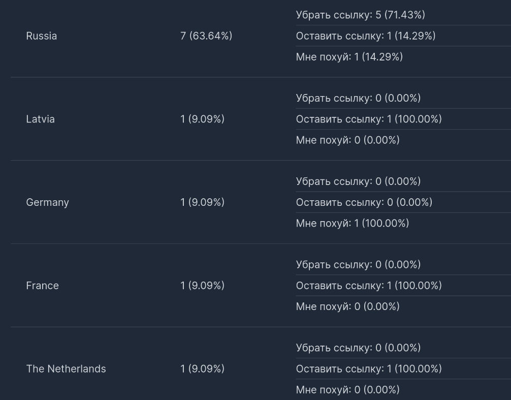 Были зафиксированы попытки фальсификации через VPN-сервисы, с целью проголосовать несколько раз. Учитывая только голоса с российских IP-адресов (21 участник), то результат всё равно остаётся неизменным - большинство из тех, кому не было похуй, проголосовали за удаление ссылки.