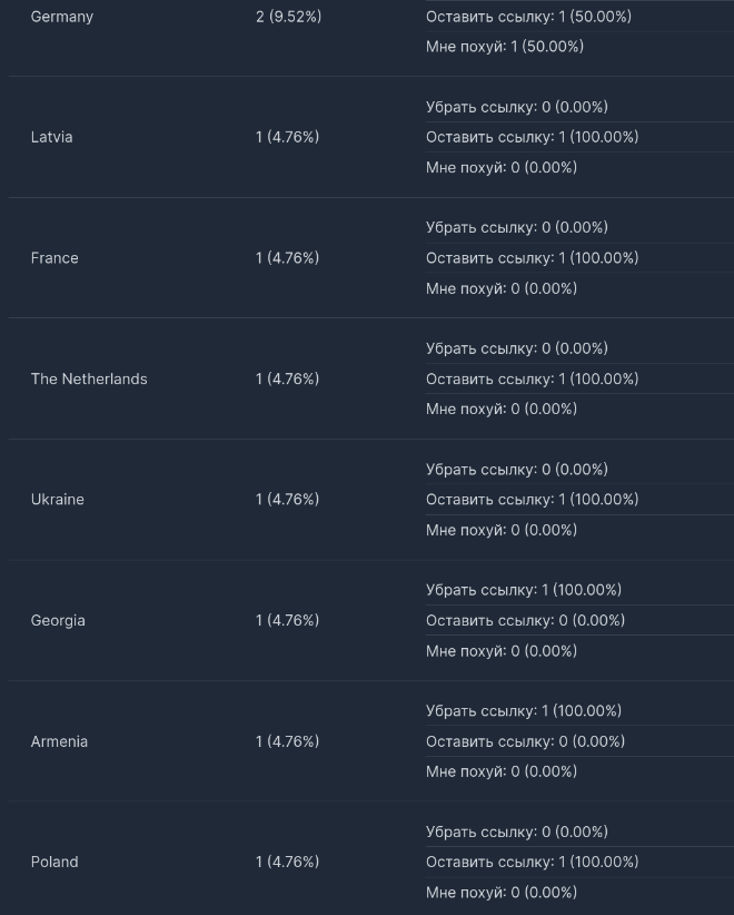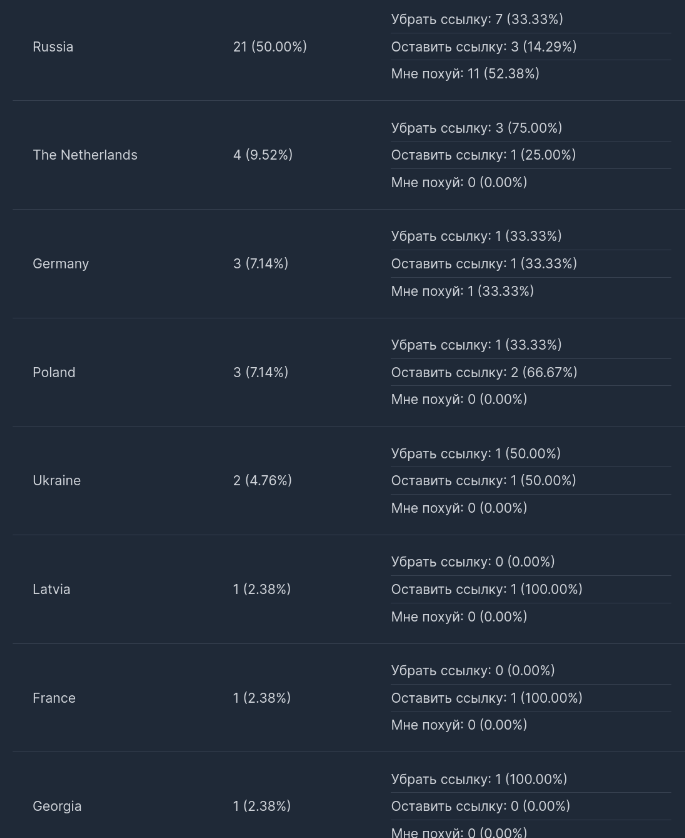 Всего 21 (50.00%): Убрать ссылку - 7 (33.33%) Оставить ссылку - 3 (14.29%) Мне похуй - 11 (52.38%)