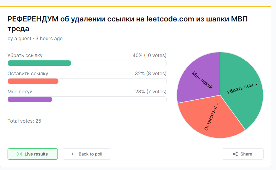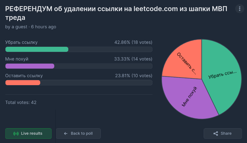 Напоминаю, что в данный момент проходит референдум об удалении ссылки на LeetCode из шапки МВП треда.