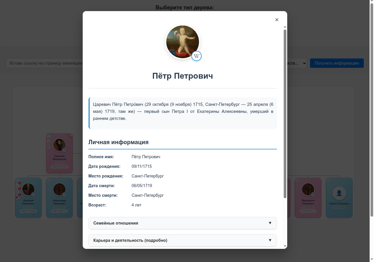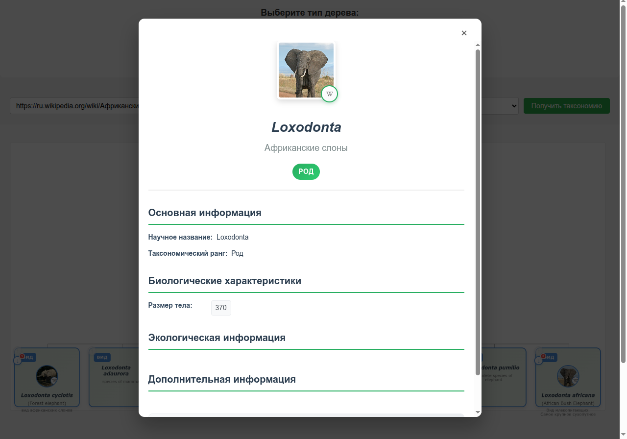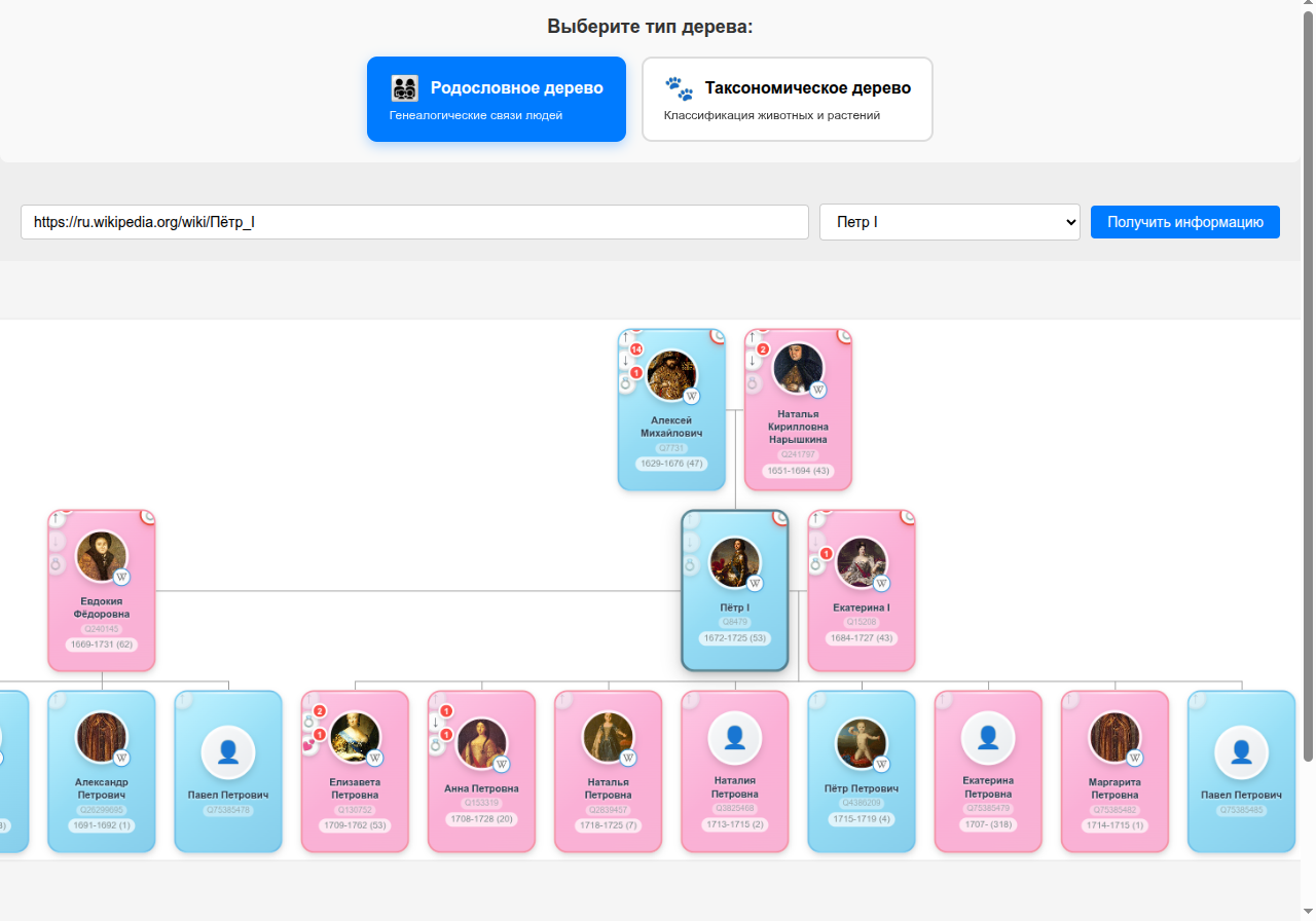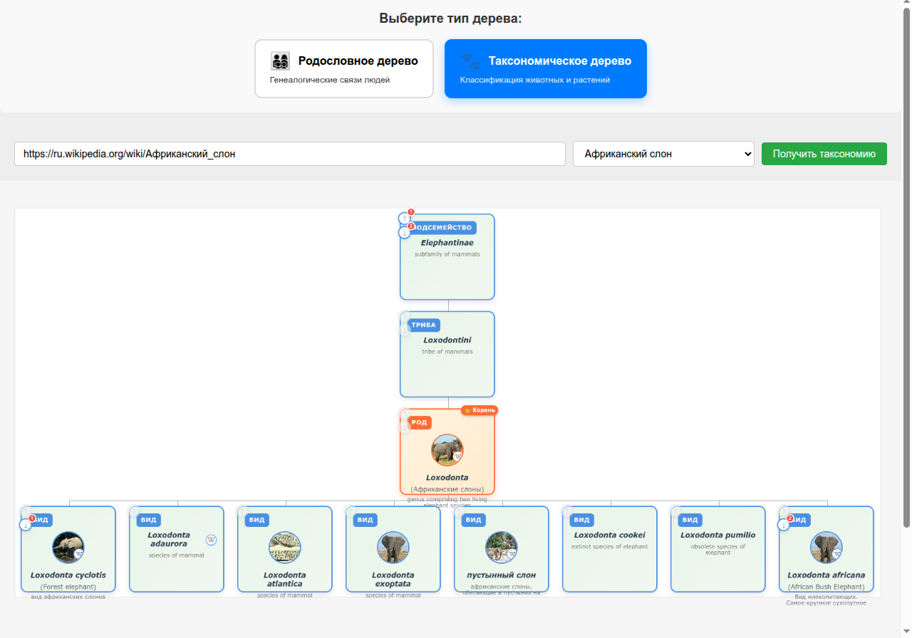 В этом приложении можно вставить ссылку на Википедию на человека или животное и получить его дерево. Семейное для людей и таксономическое (семейство/род/тип и тд) для животных.