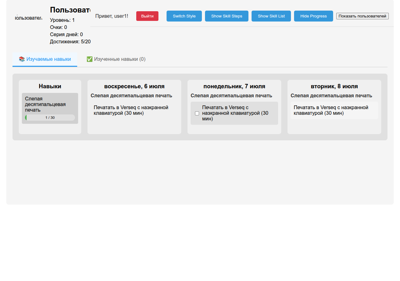 Все навыки разбиты на разделы и подразделы. Упор сделать на обучение без платы за курсы, информация должна быть в бесплатном / условно-бесплатном доступе. Будут элементы геймификации - очки, ачивки, счётчик дней без пропусков и тд. Комментарии под каждым путём, список изученных тобой/другим человеком навыков по категориям.