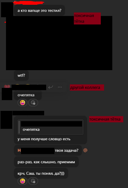 @ ТИМ ЛИД ДОБАВИЛ ЗАДАЧУ В СПРИНТ @ ЗАДАЧУ ВЫПОЛНИЛ @ СПУСТЯ ТРИ МЕСЯЦА @ ТЕХ ЛИД @ А МЫ ЧТО ПОДДЕРЖИВАЕМ ФИЧУ Х? @ ДА @ А ВРОДЕ НЕ ДОЛЖНЫ, МЫ НЕ ТЕСТИРОВАЛИ РАБОТУ ЯДРА С ТАКОЙ ФИЧЕЙ @ КОЛЛЕГА @ ДА-ДА-ДА, ПОСЛЕДНИЕ ПРОБЛЕМЫ С ПРОДУКТОМ ЭТО ТОЧНО ИЗ-ЗА ЭТОГО. АНТОН ХУЙНЮ КАКУЮ-ТО СДЕЛАЛ И ТЕПЕРЬ НИЧЕГО НЕ РАБОТАЕТ, АЗАЗАЗА @ ТЕХ ЛИД @ УСПОКОЙСЯ ОЛЕГ, ТАКИЕ ЖЕ ПРОБЛЕМЫ НА ТВОЙ СТОРОНЕ, ТАК ЧТО ПРОБЛЕМА НЕ С ФИЧЕЙ Х @ ДРУЖНЫЙ СОВСЕМ НЕ ЗМЕИНЫЙ КОЛЛЕКТИВ