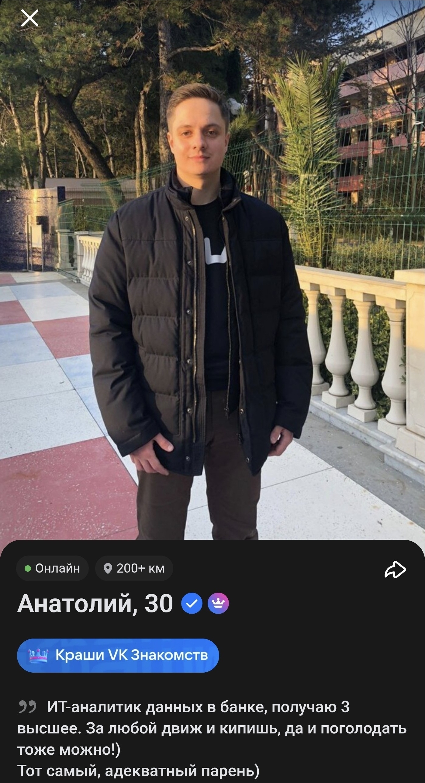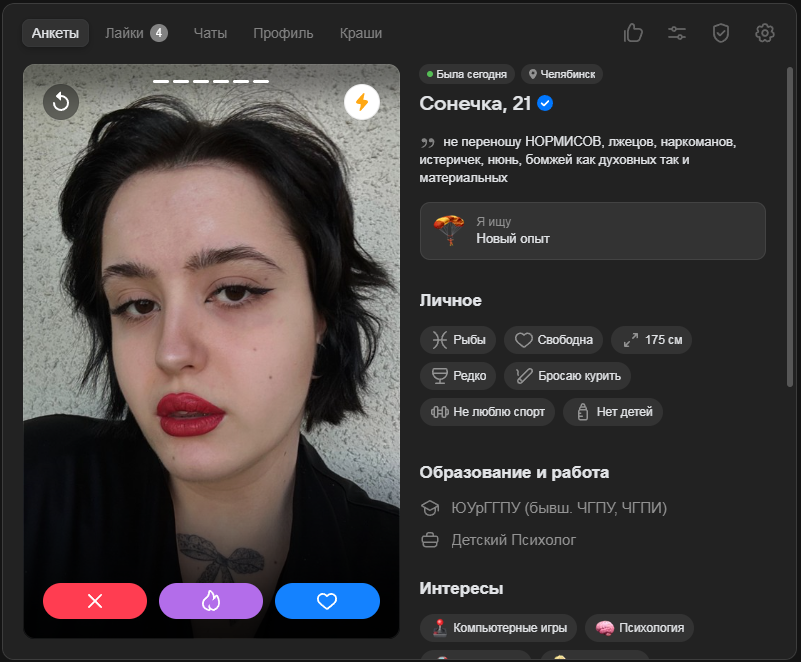 ДВ реально скурвился или я что-то не понимаю? Живу в мухосрани 150к, 27 лвл сейчас, лет 5 назад там активно сидел и получалось выцеплять зумерш на прогулки, каких-то просто на интересное общение. С одной таки даже удалось построить длительные отношения, которые кончились совсем недавно. От скуки чердак потек, решил снова пошерстить анкетки, и как же я охуел, когда понял, что выбирать-то не из чего стало. Для чистоты эксперимента анкету сделал вот прям как тогда - возраст, фото, текст. Количество тянов там будто сократилось, нахуй, в разы, а интересных анкет так вообще не дождешься - я про те, где хотя бы пара-тройка предложений есть, которые косвенно дают понять хоть что-то об организации внутреннего мира очередной персонаж_ки. Если раньше я лайкал ну условно каждую 10-ую и набраться их могло до конца пула штуки 3-4, то сейчас пул анкет из моего города кончается без единого лайка с моей стороны, после него уже начинаются другие соседние города в которых всё так же хуёво, между прочим . И сам лайки тоже раньше получал. Сейчас глушняк ебейший, прикола ради из других городов всё же полайкал - ноль взаимок, просто очко тотальное. Это точно не шедоубан, потому что пробовал ставить "похуй кого" - пару лайков от местных гомиков получал. В чём дело-то? Не 20 лет же прошло, ёпта.
