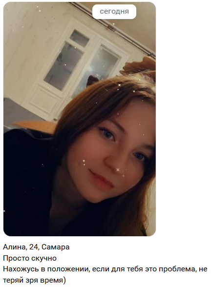 >Так и пишешь про секс, и что отношений не будет? Да >И через сколько попыток нашлись эти две тян? Одна в тот же день как установил пьюр, видимо повезло, либо там буст какой-то после регистрации дают, вторая где-то через месяц, но вторую я уже не активно искал, только когда ебаться хотелось, а первая была занята.