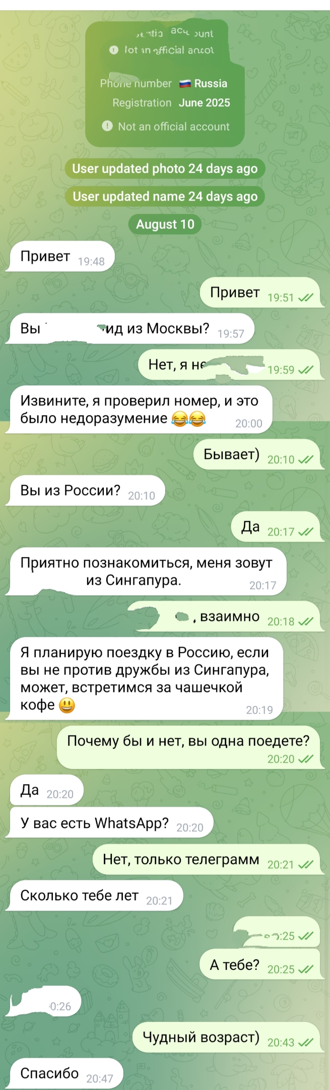 Минимальные правила предосторожности, чтобы не стать жертвой скамеров: 1) Не присылать никому всякие нюдсы и дикпики (даже без лица), не соглашаться на предложения "пошалить по вебке" и т.п. 2) Не переходить по подозрительным ссылкам в переписке (а если все-таки перешел - не вводить там никаких личных данных) 3) Не соглашаться на просьбы одолжить денег, купить что-то (в том числе билеты в театр или кино), или задонатить куда-то 4) Встречу IRL назначать только в проверенных местах и заведениях 5) Не соглашаться на предложения во что-то инвестировать или влошиться еще в какой-нибудь проект, обещающий чудесные доходы. Самый неприятный скам, поскольку перед этим тян может изображать активное и заинтересованное общение на протяжении нескольких дней, кидать кружочки и голосовухи, пока не войдет в доверие. Обычно они утверждают, что живут где-то за границей и не могут встретиться прямо сейчас, и очень быстро предлагают перенести общение с СЗ в мессенджеры. Подробнее - гуглить "pig butchering scam". К постоянному вопросу "неужели на такое кто-то ведется": лох не мамонт, лох не вымрет. Если этим продолжают заниматься - значит, кто-то ведется.