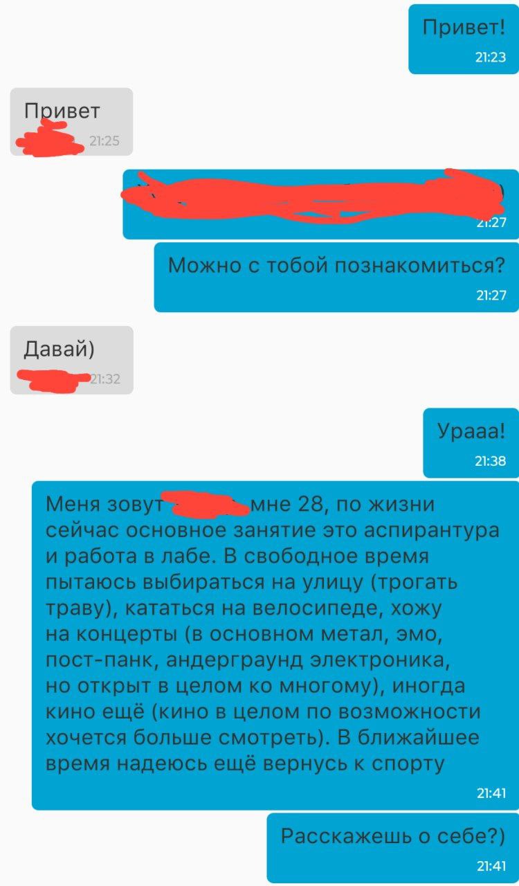 Ты мне напомнил, как примерно месяц назад я познакомился с тнёй, которая разошлась со своим парнем после 9 лет отношений. После пары встреч irl и вороха довольно вымученных пепеписок в Телеге я написал ей с дежурным вопросом о том, как прошёл день, но тутобратил внимание на её новую аватарку, на которой она улыбается в объятиях какого-то типка (сама она, впрочем, мимоходом написала, что виделась с двоюродным братом), и решил, что это выглядит достаточно однозначно, чтобы свернуть общение.