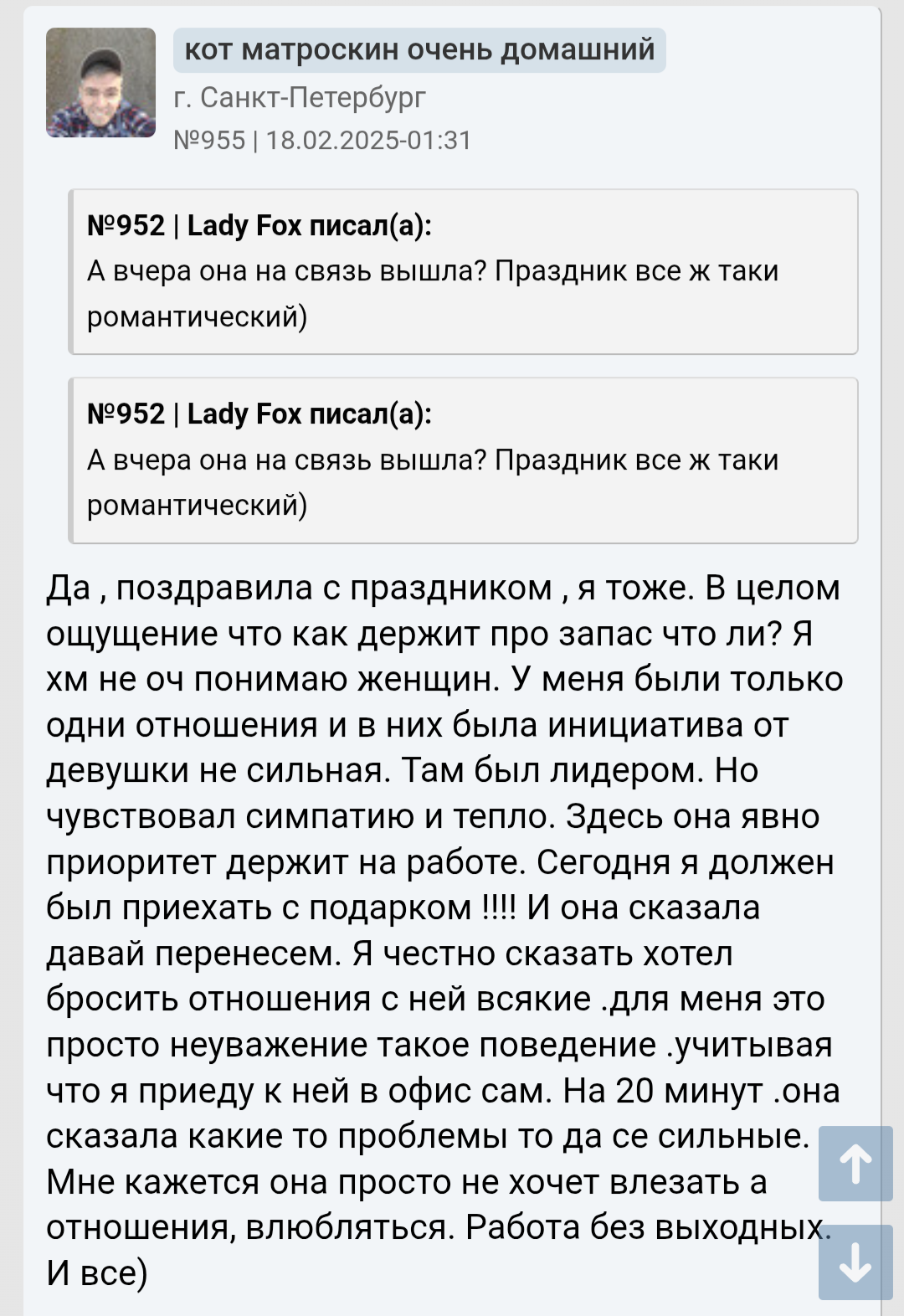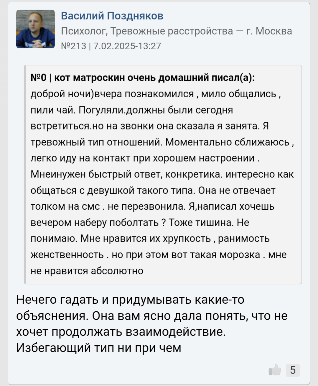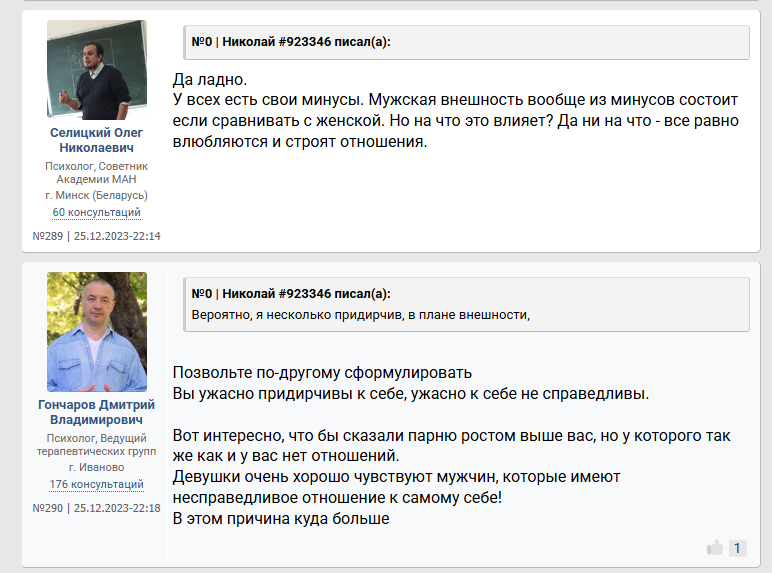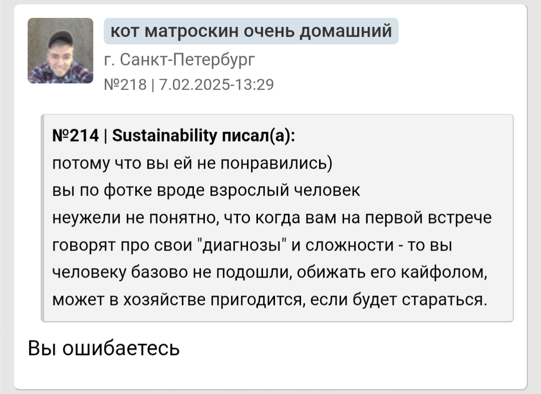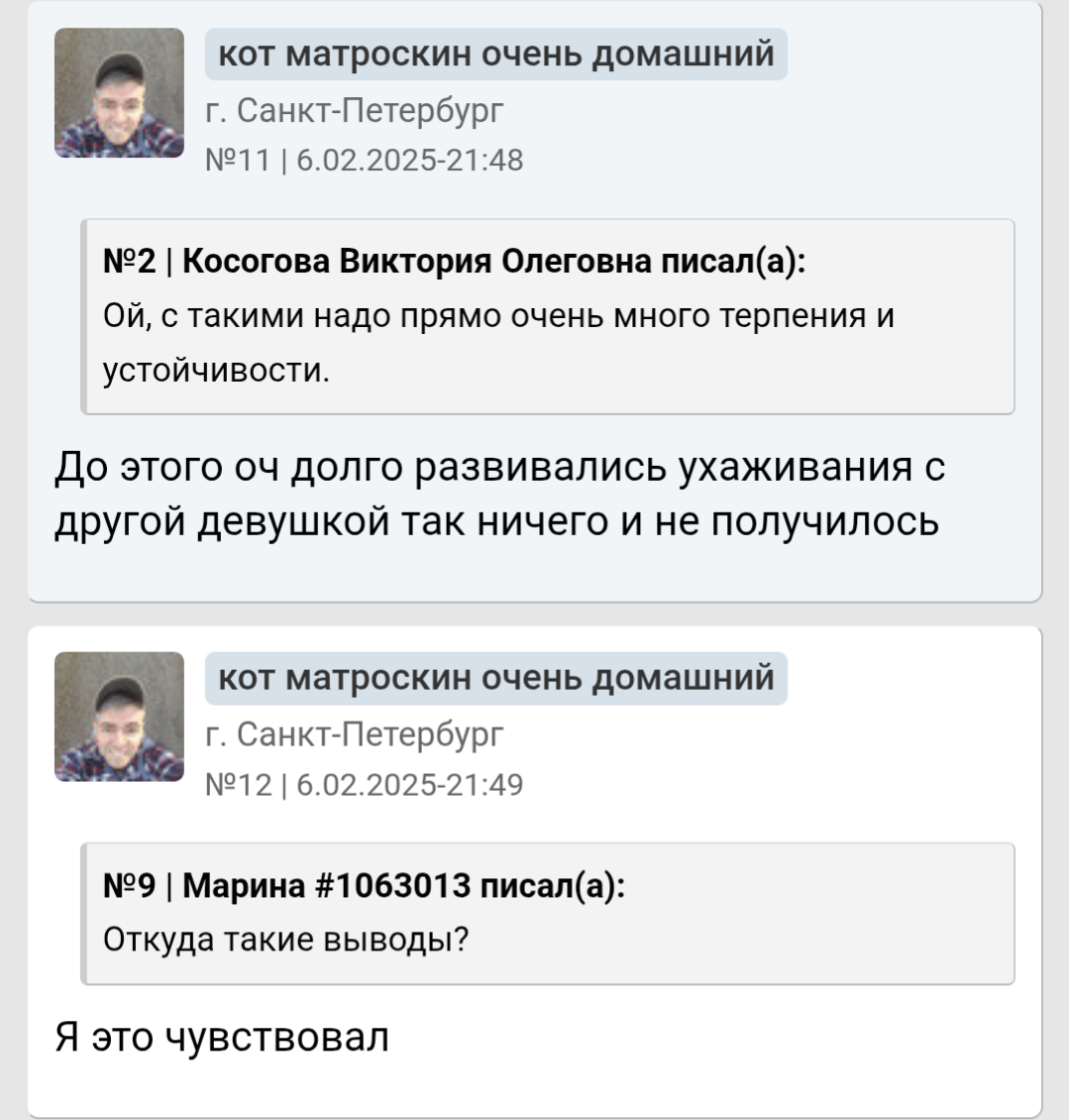 >>10285587 Он неосознанный. У любого процесса есть глубина: можно просто купить карандаши и неосознано рисовать лица людей - получится плоско, грубо и некачественно. А если осознано подходить к рисованию: понять что нет контуров - есть тени, а значит еще и свет. Художники еще более осознаны в своем деле. Так же и со свиданиями. Он пишет что просто пили чай, обнимались. Он что хотел от свидания? Какой был его мотив? Что он сделал для этого, а что нет? Как готовился к свиданию? У него нет такого уровня осознаности, как у нас инцелов, что внешность важна. Или как у пикаперов, что важна атмосфера, обстановка. Также у нас у всех есть психологические защиты, которые защищают нашу психику. У него явные отрицание и рационализация. Отрицание не дает ему осознать что он тупо ей не интересен больше - не зашел (внешне, финансово, поведением и тд). И то что он пытается понять что не так - рационализирует (ударяется в психологию, фокус смещает с себя на девушек, это как коуч джордж учит, мол у тебя не получилось? Да это она театральная просто - с такими не реально вообще, ищи пограничницу - у меня на бусти есть видео про них). Ему говорят - ты не зашел >вы ошибаетесь - опять отрицание. Он двигается по установкам "будешь ухаживать - тебя будут любить" - эта схема может у него и работала, но сейчас в силу скуфения перестала - хз, я его не знаю. По итогу: неосознанность, отрицание и рационализация психологией + некрасив и без денег (иначе бы получалось с девушками и установка "ухаживаешь - тебя любят" работала бы и он не сидел бы с психологами. 6'2 инцел на хардмаксе