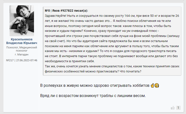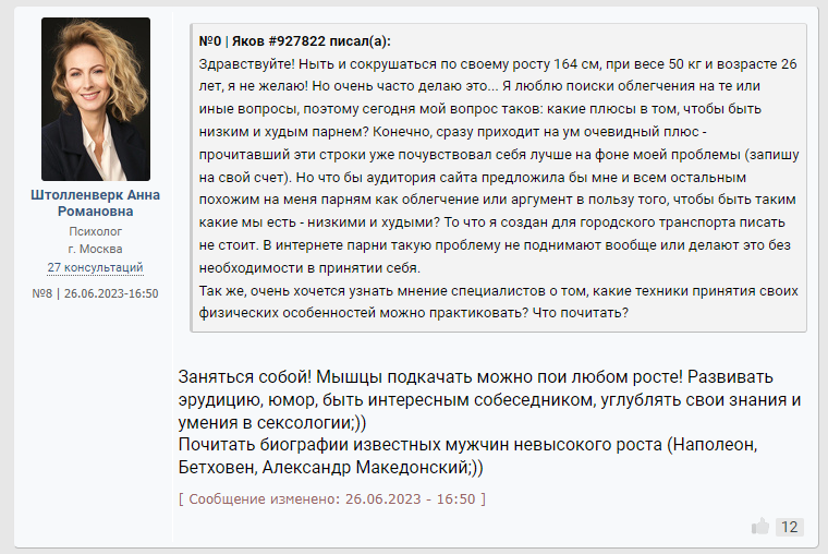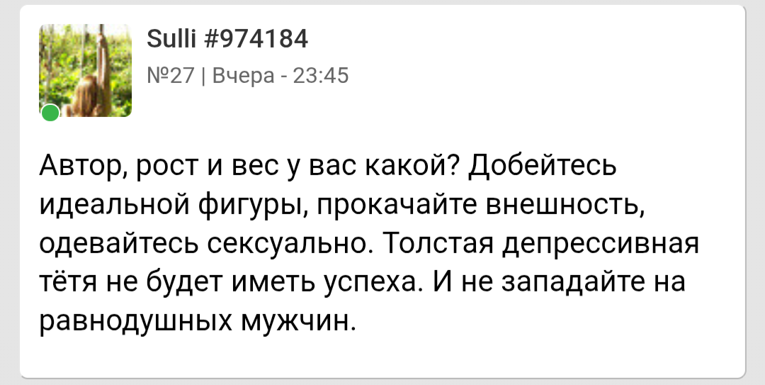 >>10284824 Помню какая то психологиня коммент оставила под опросом "что будет если вы проснётесь завтра 175 см обычным парнем" что то из разряда "Блииин уже проиграла ведь, с таким ростом только в петлю." Причём это не тролль аккаунт, а реально акк какой то пизды психологини из Мск.