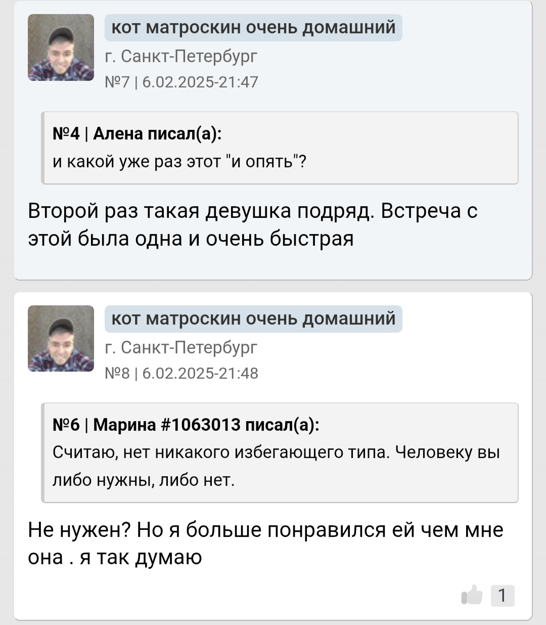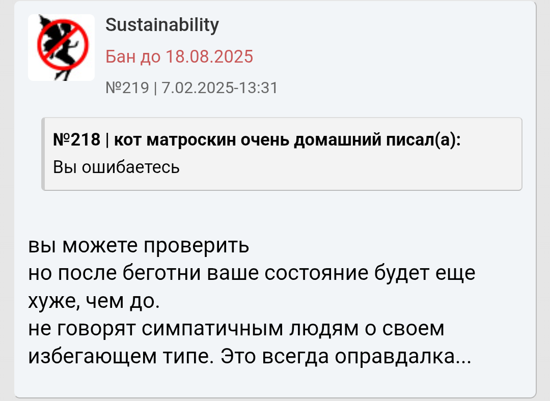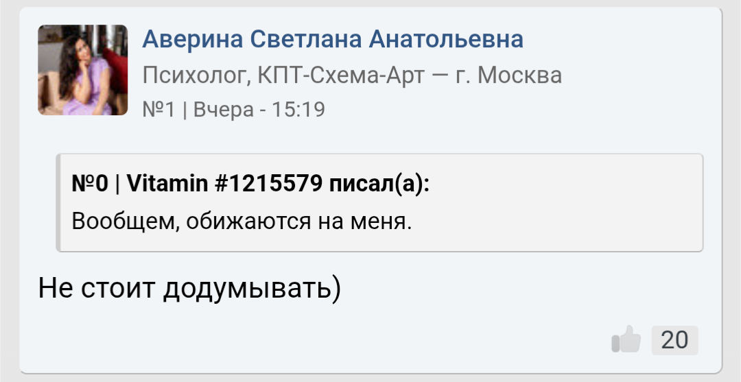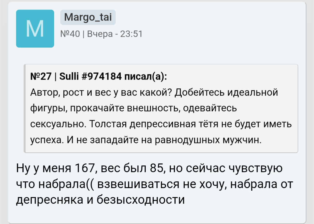 Ты мне напоминаешь бабу с b17, которая в 40 лет остается девственницей. Вместо того, чтобы сблизиться с каким-нибудь мужчиной из окружения , она 2 года переписывается с чуваком из Африки. И спрашивает у психологов почему она девственница.. https://www.b17.ru/forum/topic.php?id=301987#topic_top