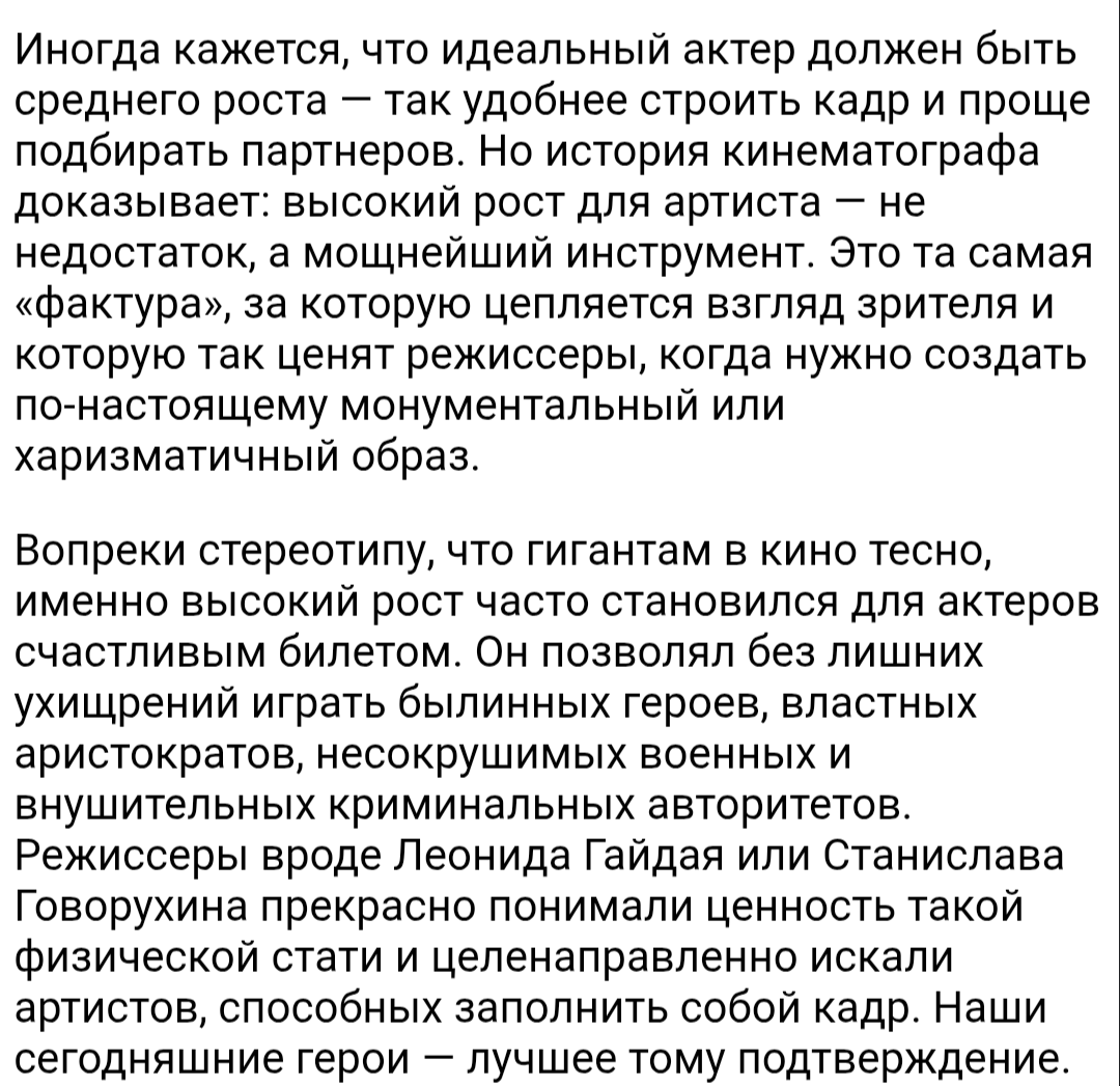 >высокий рост для артиста — не недостаток, а мощнейший инструмент. Это та самая «фактура», за которую цепляется взгляд зрителя и которую так ценят режиссеры, когда нужно создать по-настоящему монументальный или харизматичный образ.