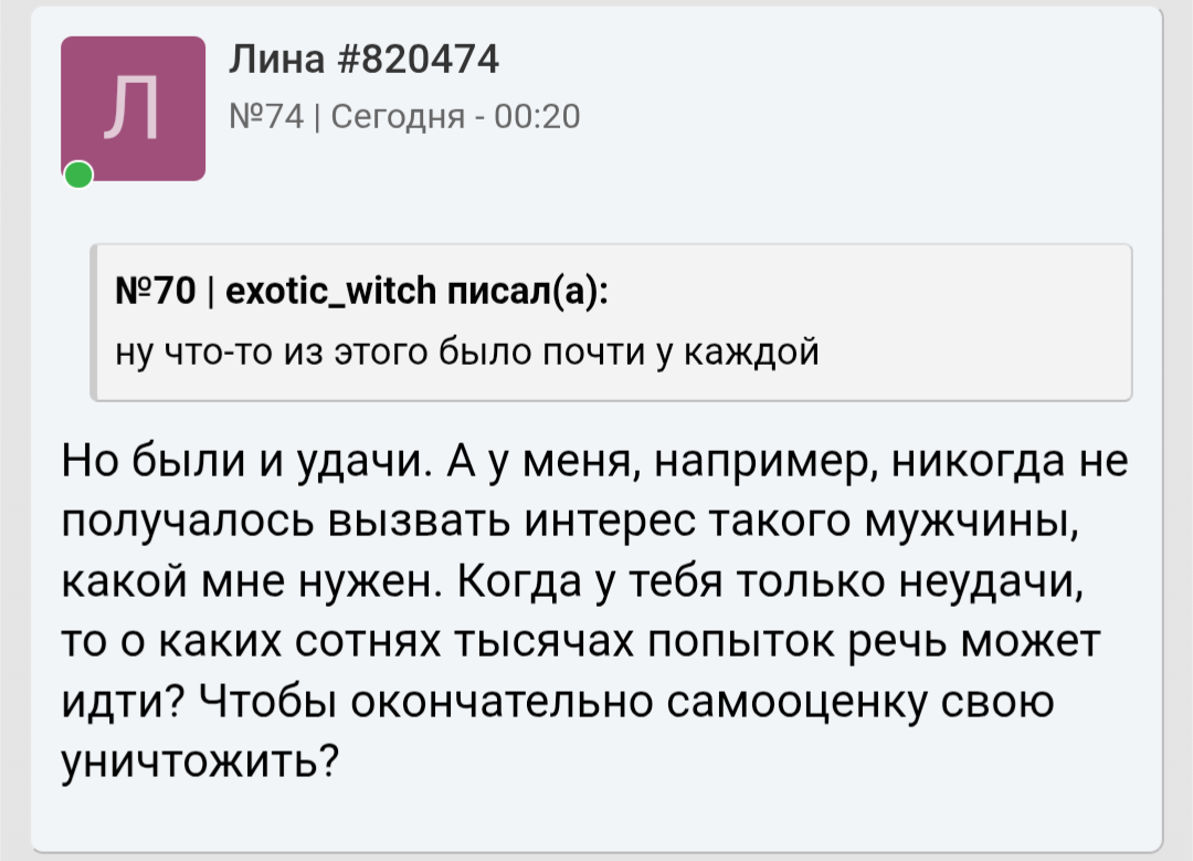 Да, не выбирал, но возможности у меня были. Я даже не урод, а просто обычной внешности. Для своего возраста выгляжу хорошо. Ростом не высокий - 175, но и не карлик. Да и пока другие строили карьеры, учились, развивались, я фрустрировал, находился в вечной апатии, тоске, депрессии, самокопаниях, ну и лени. Лень и вечное откладывание всего на потом - это опрделяющая меня черта. Вот я все лето планировал подойти и познакомиться, но так и не решился, хотя, как я уже писал, мне каждый день девушек 5 точно нравится, а то и под 10 набирается. Вот, например, на днях в аптеку заходил напротив дома, а там молодой фармацевт работает, очень симпатичная, милая. Но я понимаю, что будет отказ в 99%. Вроде бы, что мне терять? Совершенно нечего, вот прям сейчас иди, подкатывай, получай отказ, да действуй дальше, а я не могу. Ну и конечно, комплексов из детства тоже много, спасибо мамаше: неуверенность в себе, страхи всякие. И на фоне всей своей жизни, всех проебов, я очень сильно стал себя ненавидить. Дело не только в женском поле, а в целом: мужчиной себя не чувствую.
