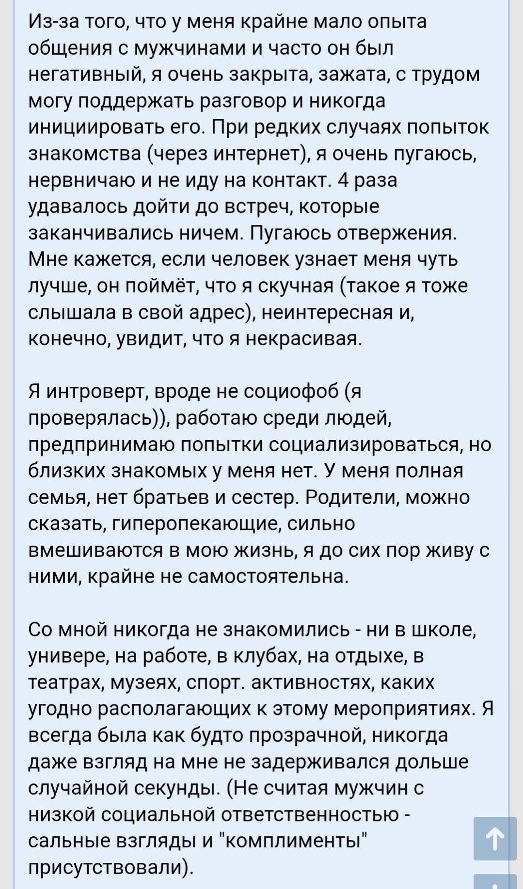 >>10288191 Вопрос как она найдет сыча такого? На СЗ? На дваче знакомствах? Мимо сыч подходящий под твое описание, но сам написывать тянкам на сз я не могу. Тип реалистично что если я запилю анкеты где только можно то мне может написать такая тяночка с оп поста? Или же это наивные мечты. У меня еще внешка на любителя, я далеко не мужественный, но и не женственный, андрогинное лицо, бледная кожа, 185,75кг, длинные волосы, 33 лет, не лысею (пока что лол). Кто-то давал мне 7, кто-то 1-2. В универе были тян которые сами лезли знакомится и хотели отношений, были комплименты от некоторых девушек, в целом когда иду по улице тянки от моего вида не морщатся, часто нейтральное выражение лица. От чего я могу сделать вывод что я не урод хотя бы.