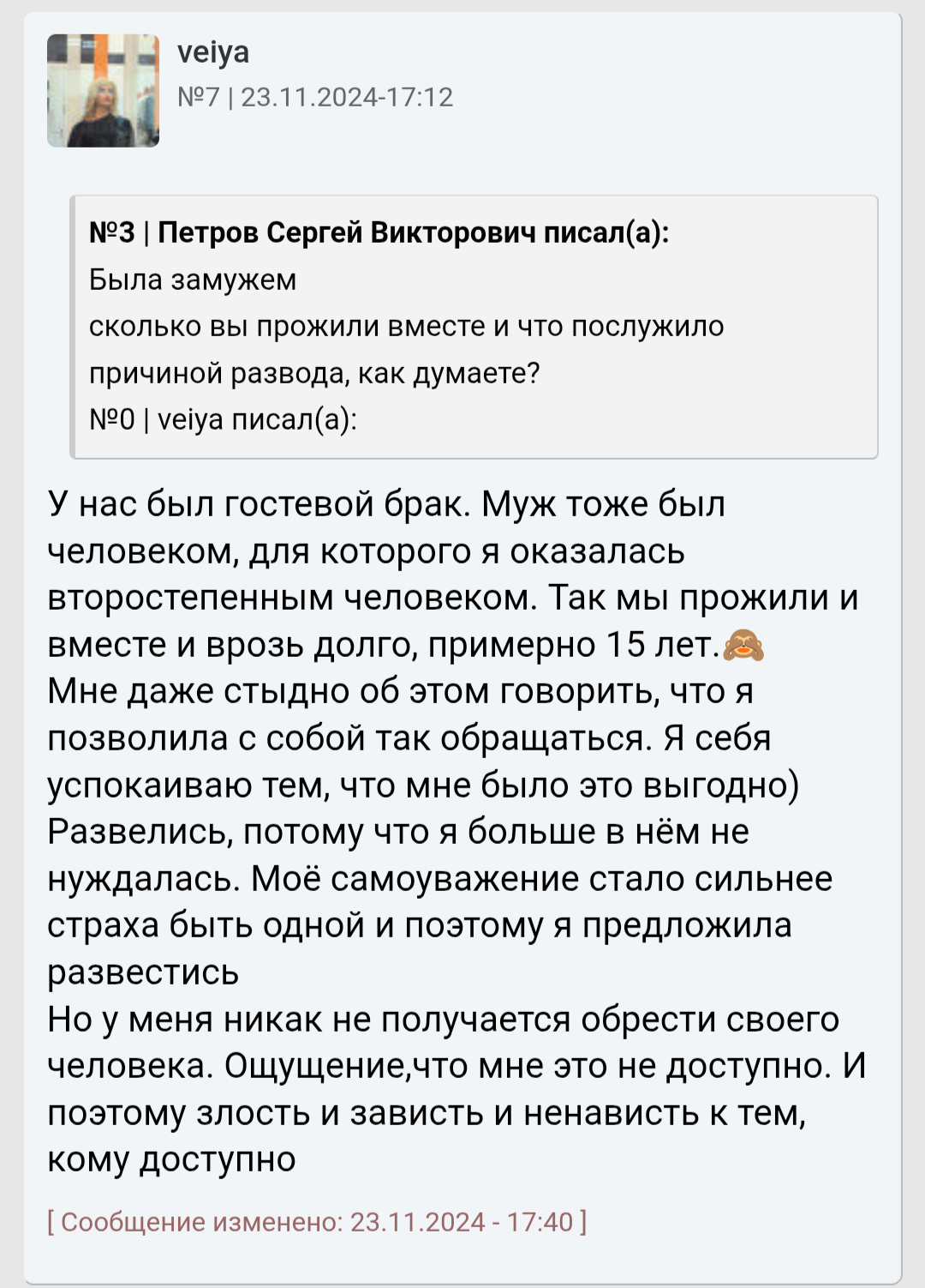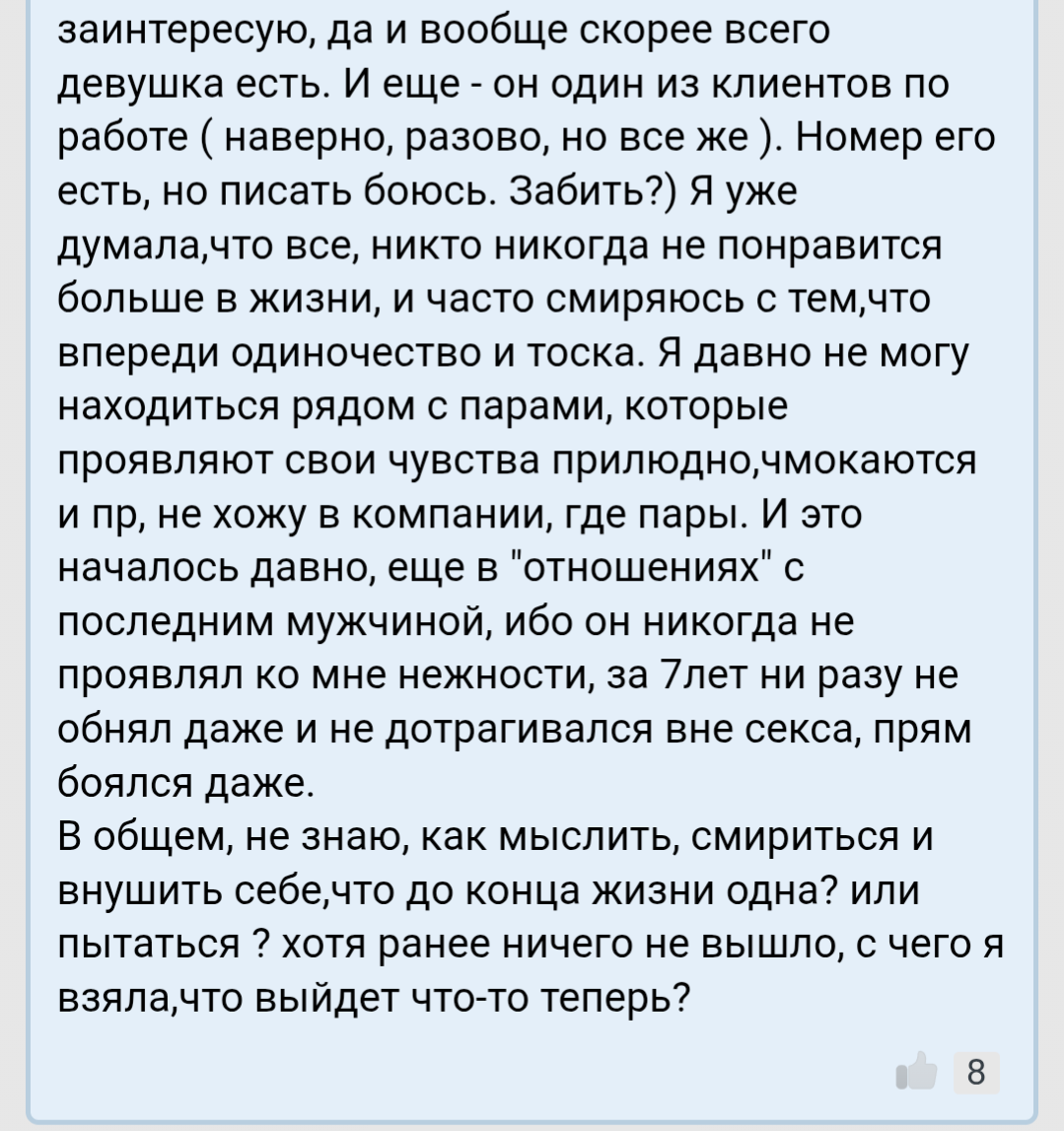 Ну да, мое разочарование в отношениях - продукт личного опыта. Это не рассуждения о каких-то мифических мужчинах, которых я вживую ни разу не видела.
