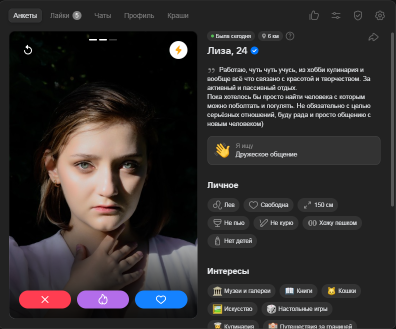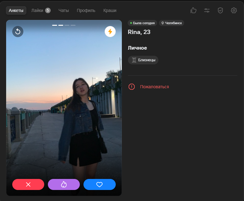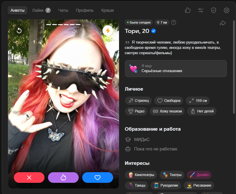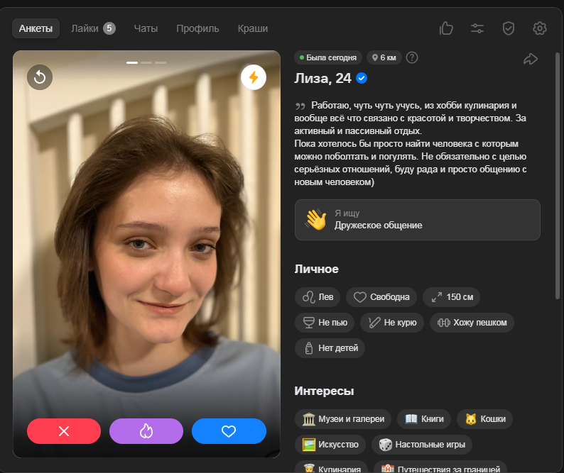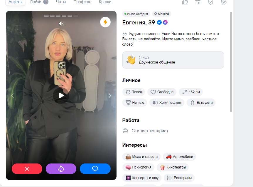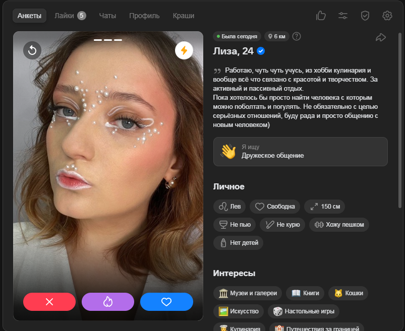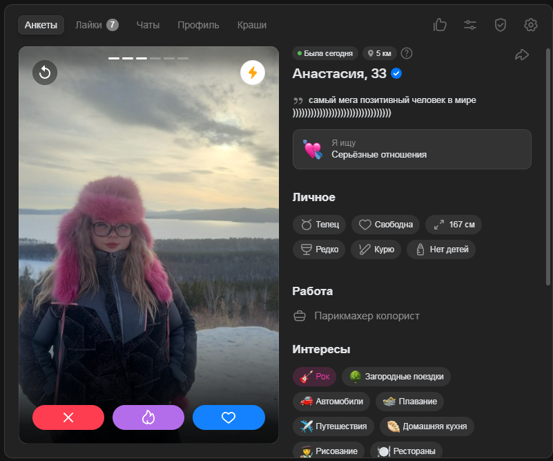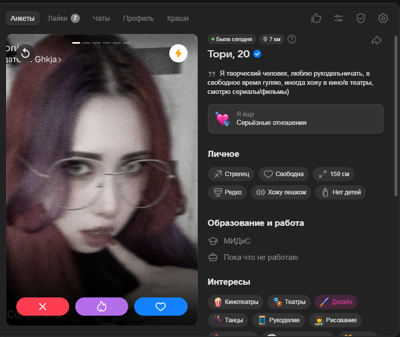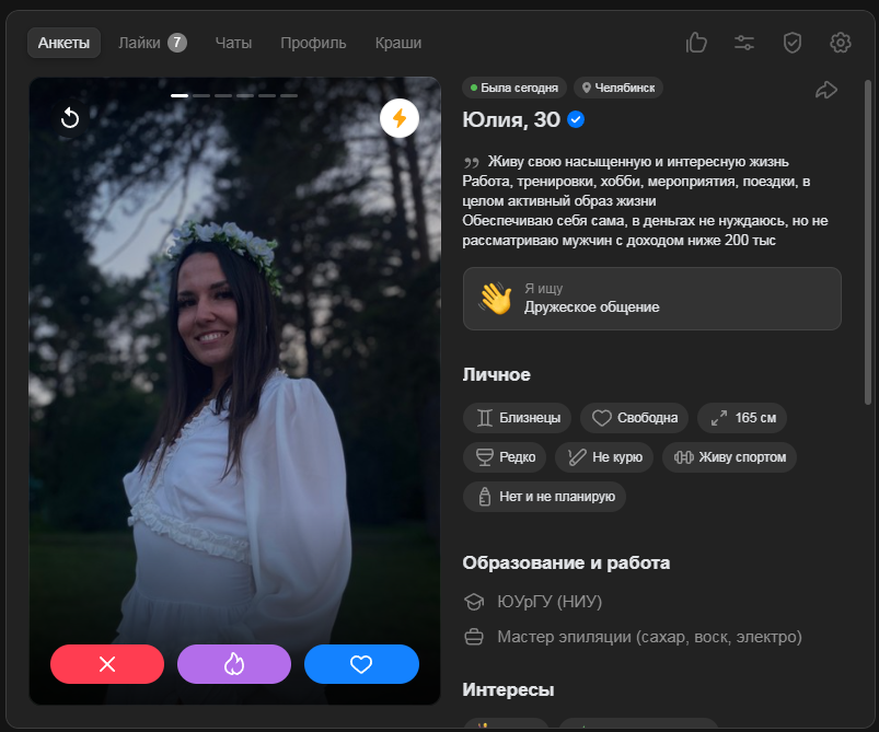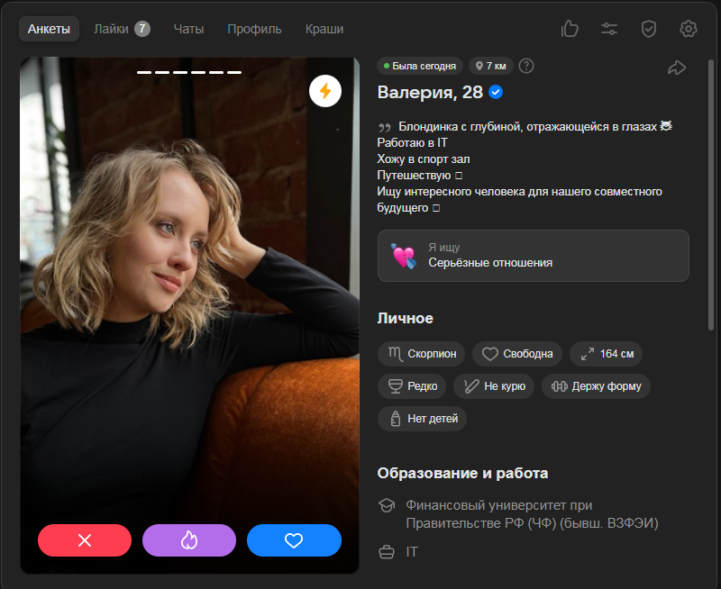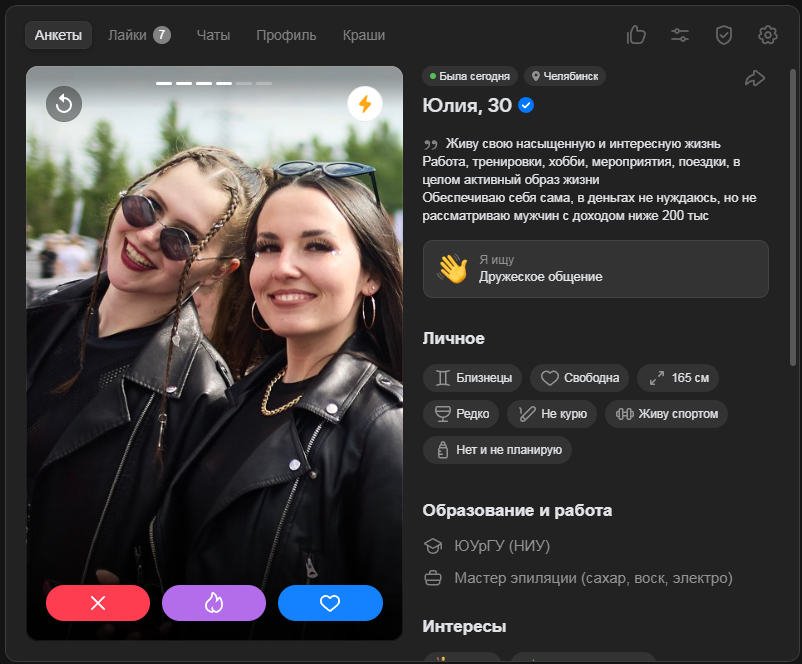Это я вам говорю как чел который когда 7 лет назад в тиндере регался, сходу получал 10-20 матчей и затем стабильно по 2 в день лайка, сука по 4 свидания в неделю было.