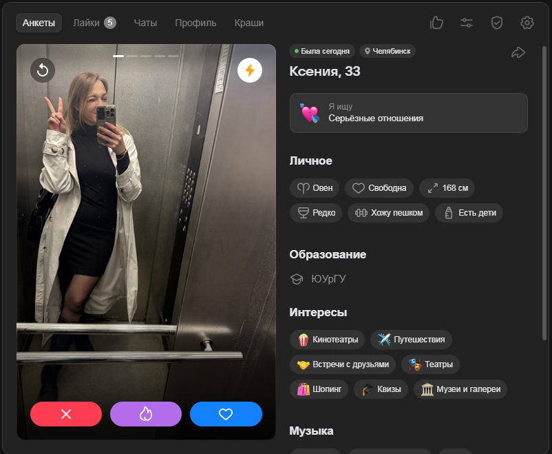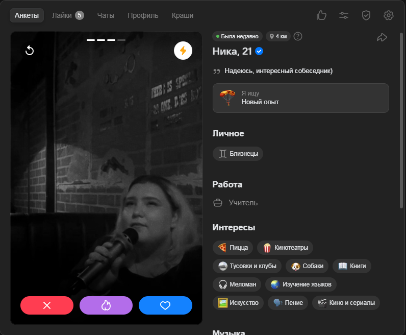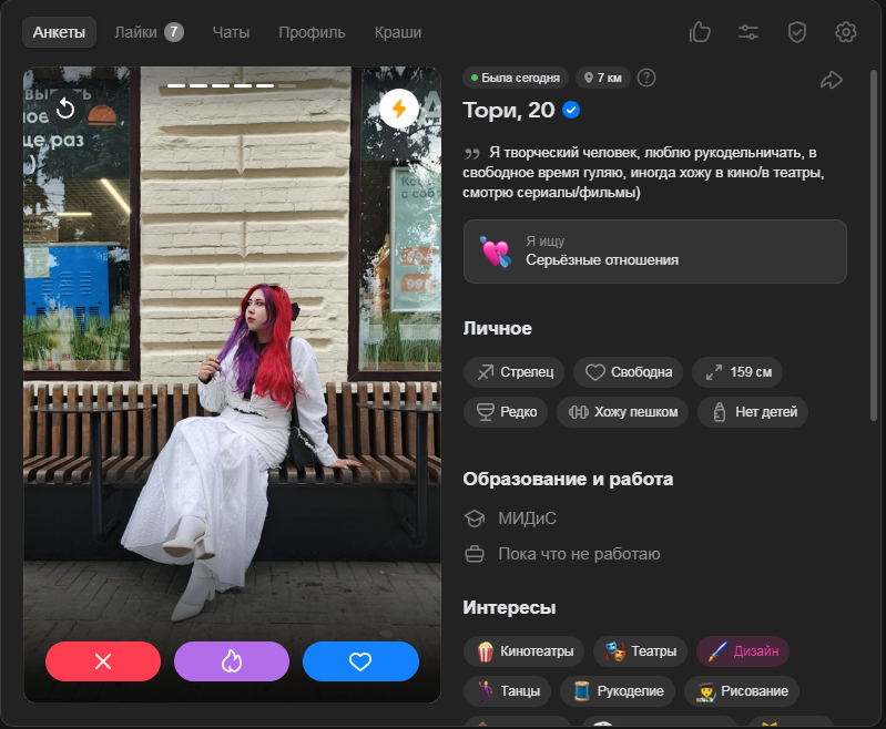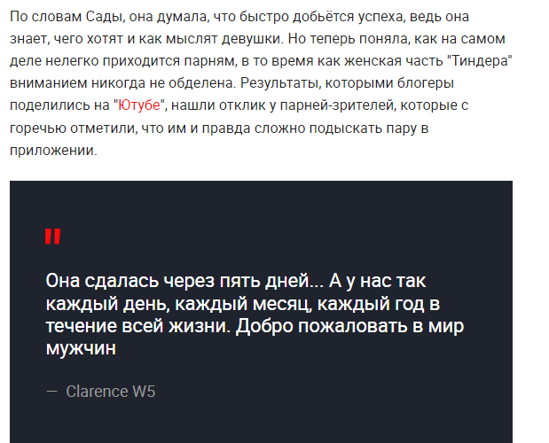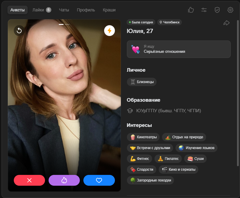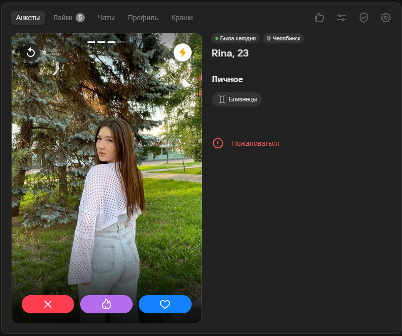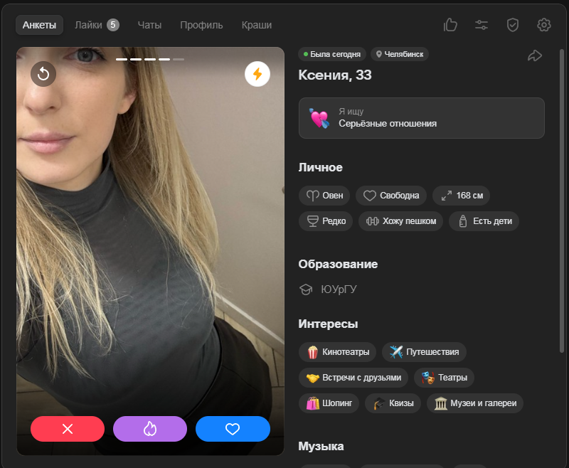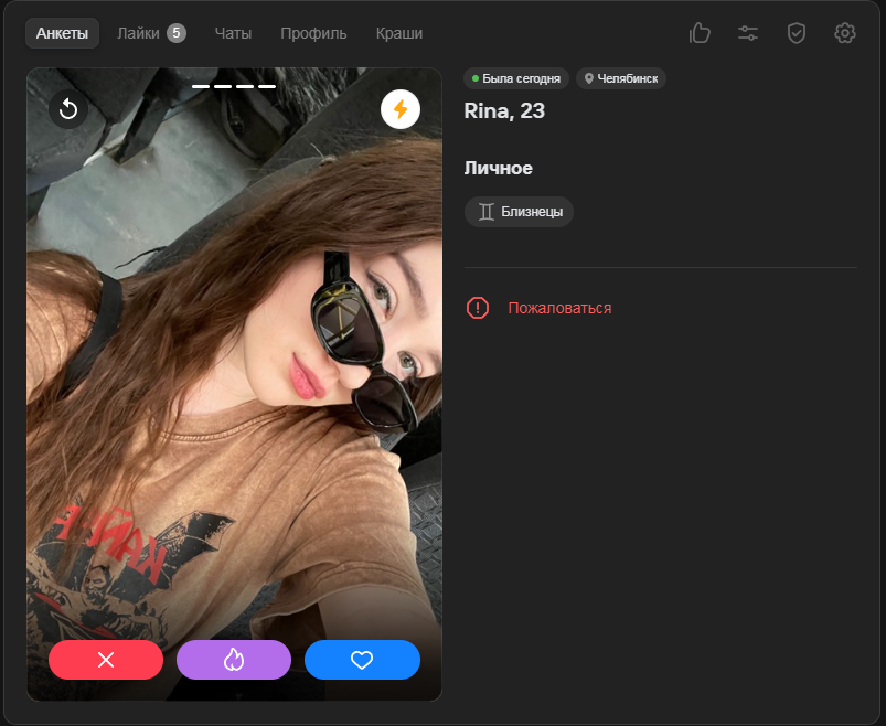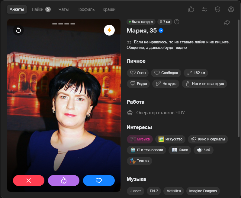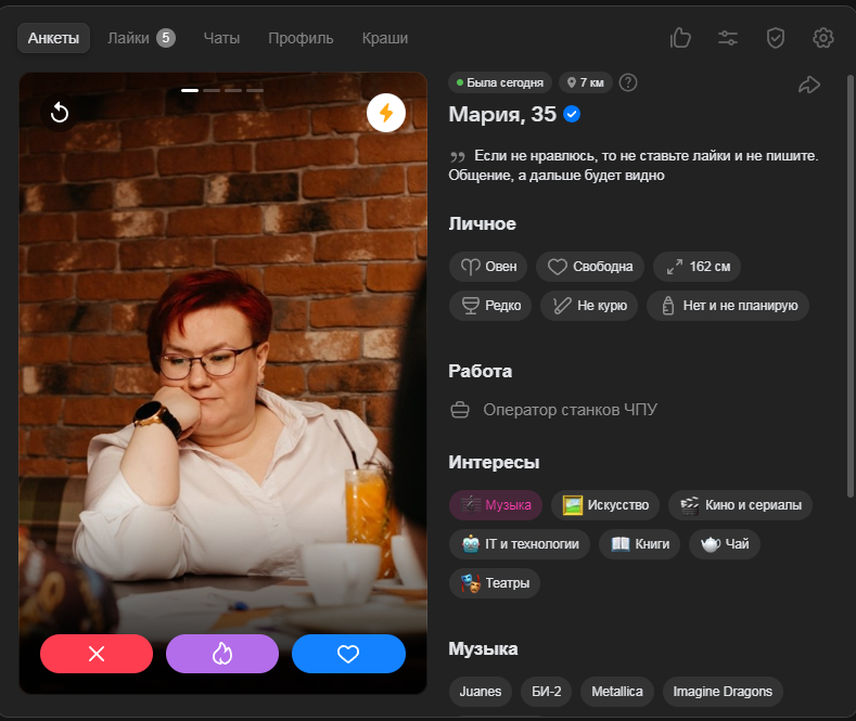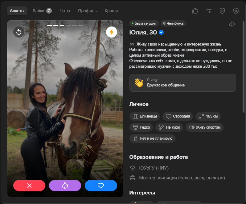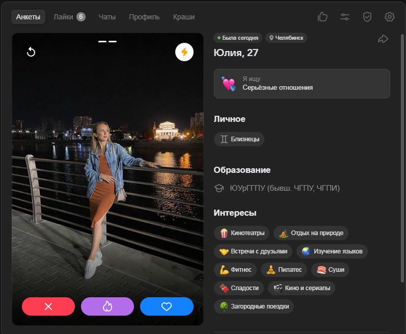 Это я вам говорю как чел который когда 7 лет назад в тиндере регался, сходу получал 10-20 матчей и затем стабильно по 2 в день лайка, сука по 4 свидания в неделю было.
