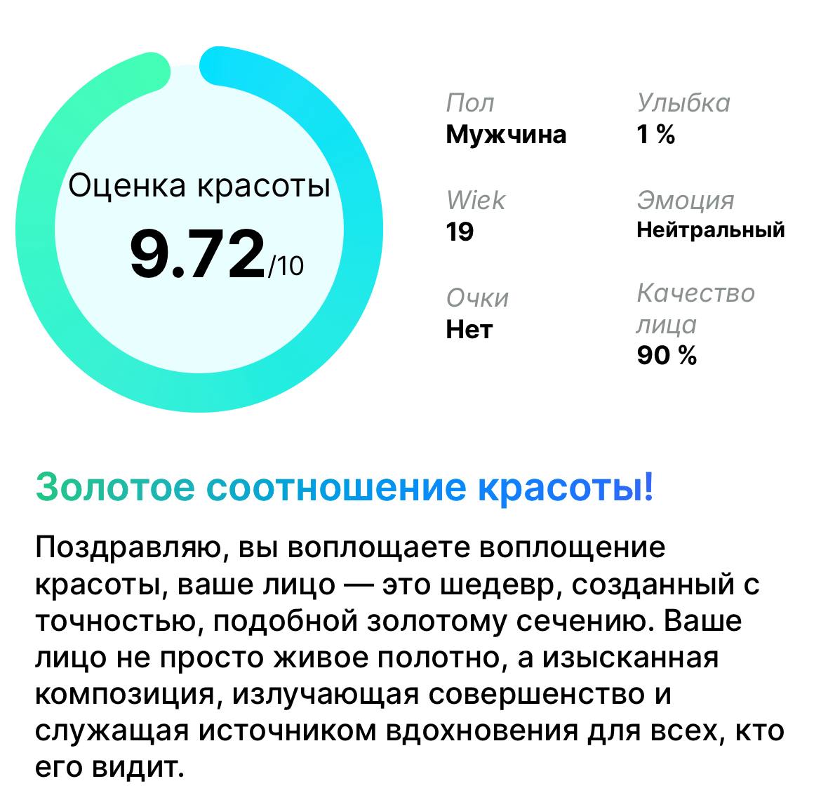 >>10303288 Сейчас ещё раз оценил, стало интересно. Здесь я не полностью сделал оценку: >>10303314 Вот на пикчах теперь полный результат. Сначала своё фото загрузил, где мне 18, потом второе, где мне уже полных 30. Ну и общая, что в 18, что в 30 одинаковая. Ну хз короче, насколько оно это всё правдиво конечно.