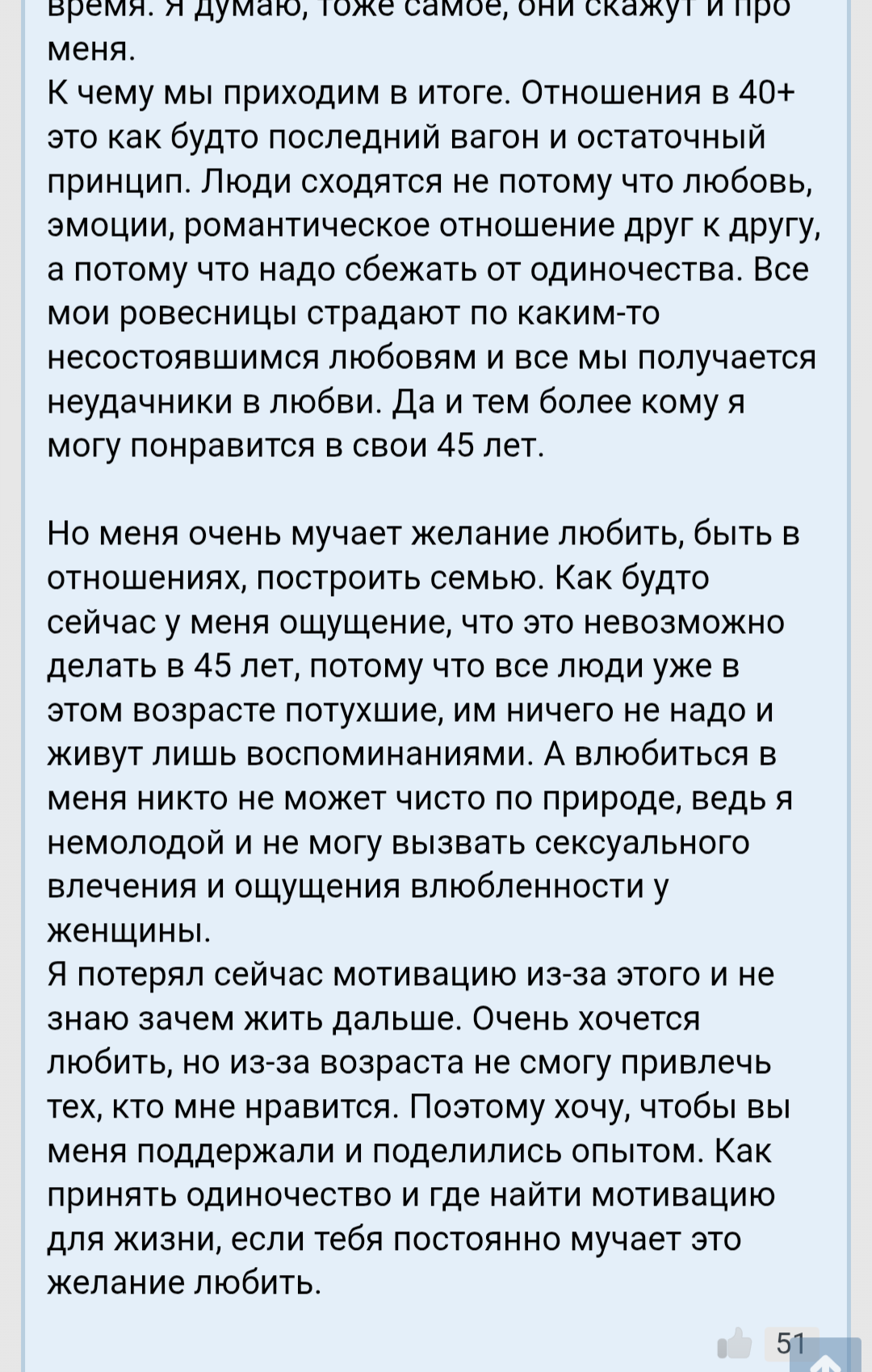 >>10306549 Вспомнился, кстати, один момент из прошлого: у родителей были гости и к нам пришел один из папиных друзей, с которым мы всегда хорошо общались. Мы пошли как обычно курить на балкон, разговорились по поводу отношений и он мне тогда одну фразу сказал, что, типа, у тебя есть буквально пару лет, чтоб найти себе женщину и создать семью, а потом уже поздно будет. Мне тогда было 29. А пару лет назад опять зашел разговор и он сказал, что, типа, теперь только разве что вдовушку себе найдешь. Я всему этому не предавал значение, что тогда, десять лет назад, что во время нашего последнего разговора 2 года назад. Вот откуда он знал? Он ведь даже не в курсе по поводу моих проблем с женским полом!