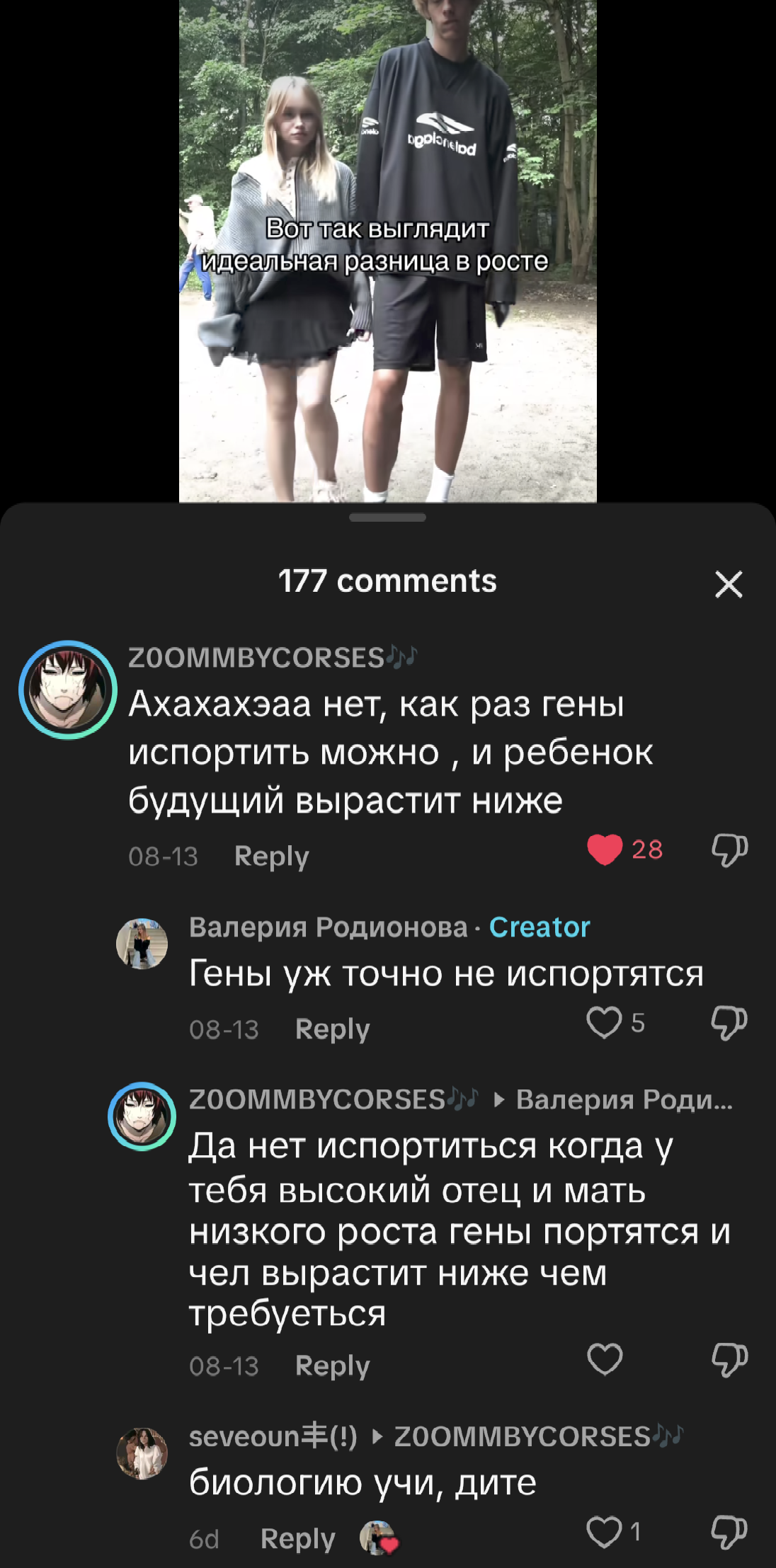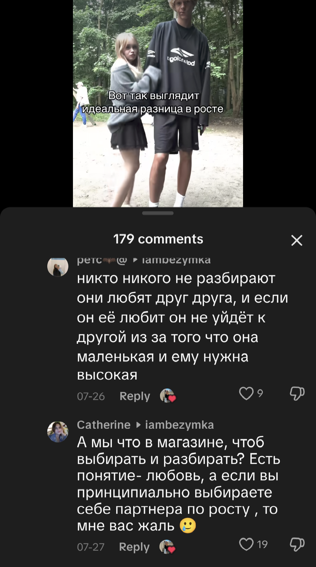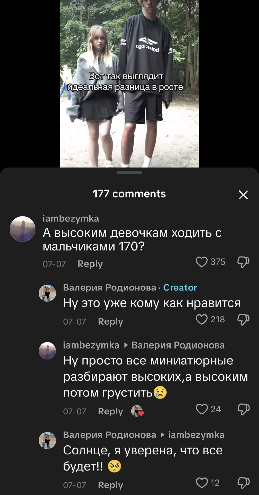 Комменты просто атомный блэкпил тут. Нашел только что. - А высоким девочкам ходить с мальчиками 170? Ну просто все миниатюрные разбирают высоких,а высоким потом грустить😢 - Солнце, я уверена, что все будет!! 🥺 - Ну блин,разве это хорошо,когда партнер ниже тебя?