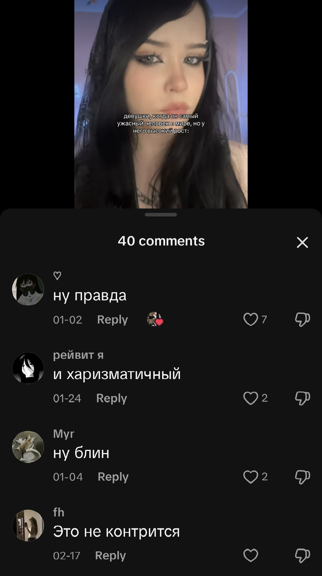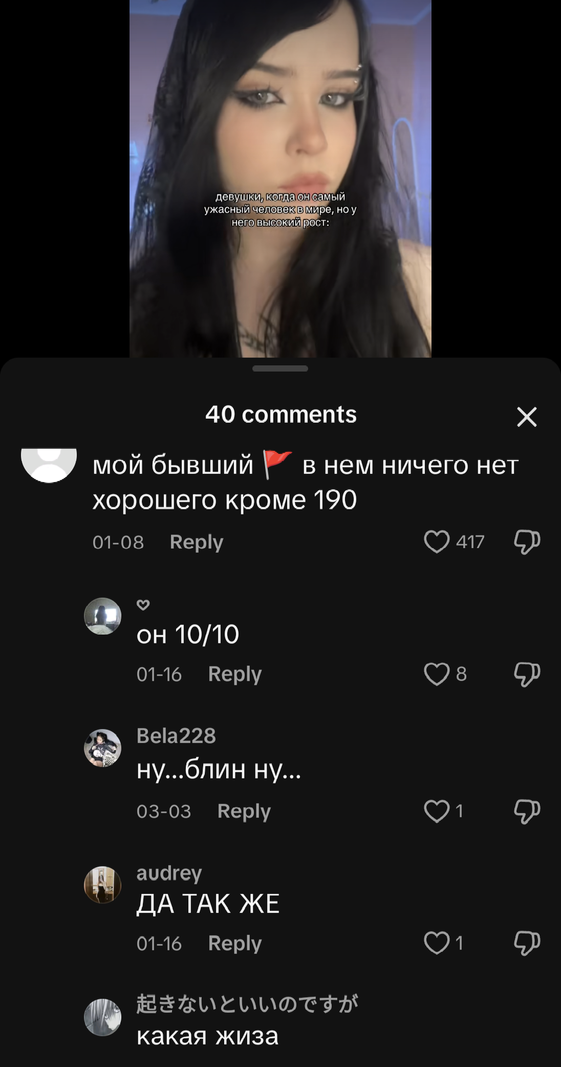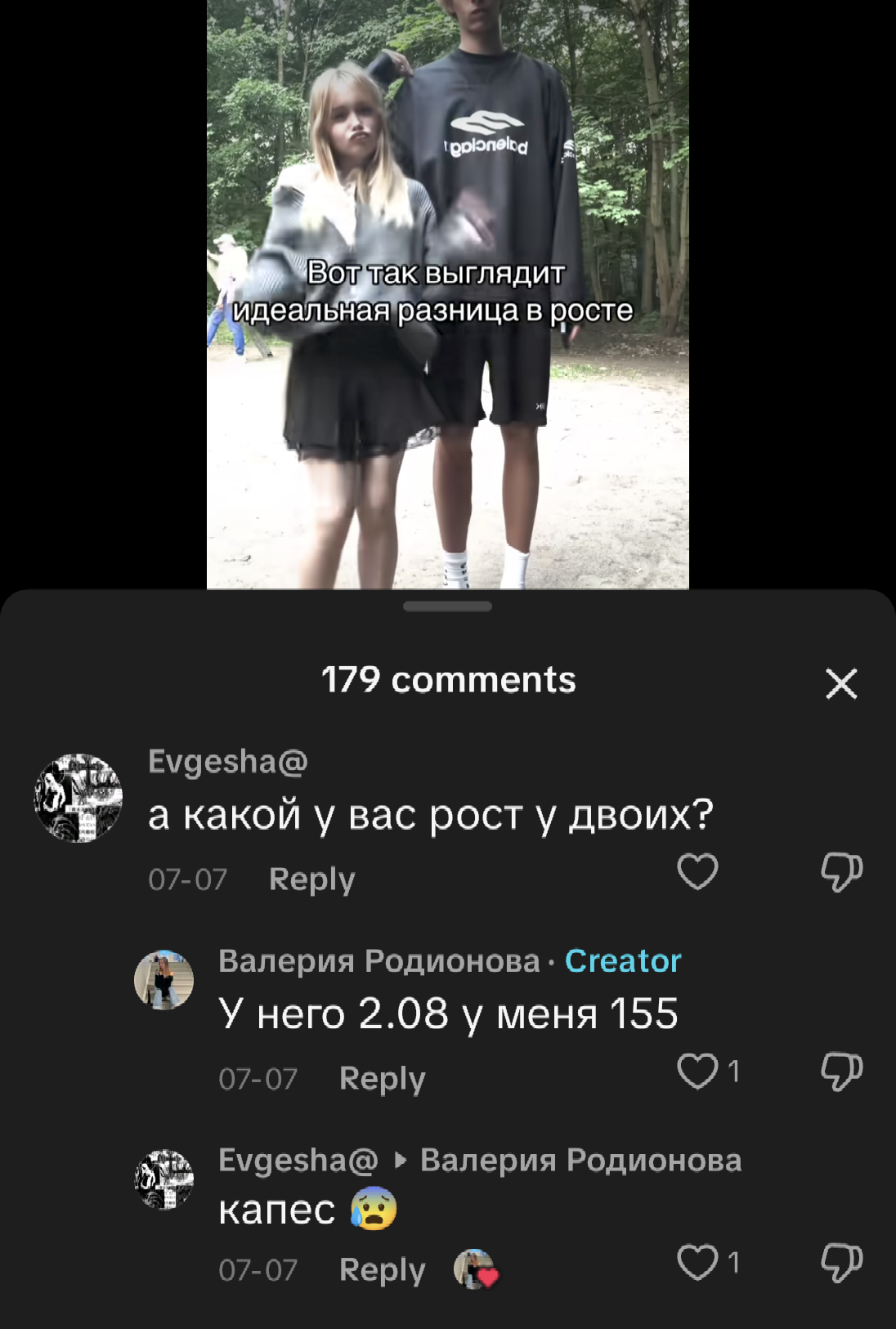 Комменты просто атомный блэкпил тут. Нашел только что. - А высоким девочкам ходить с мальчиками 170? Ну просто все миниатюрные разбирают высоких,а высоким потом грустить😢 - Солнце, я уверена, что все будет!! 🥺 - Ну блин,разве это хорошо,когда партнер ниже тебя?