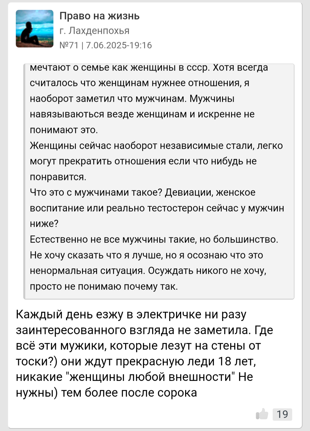 А причем тут двач? У меня есть жизнь и за пределами бороды. И тут не только инцелы, тут разный народ, вот я и спрашиваю советов годных и не очень По факту привел себя в хорошую форму, лишнего веса нет, все в норме, но все равно так и не решился хотя бы разок подкатить за всё лето. Так что, толку то от формы, если у меня блок на знакомства. Я просто осознаю, что самый обычный и не молодой мужик, так что шансы мои очень и очень печальные. Ну и меня кроет от осознания, что это лето было последним летом моего четвертого десятка, следующим летом, если доживу мне уже будет 40, а для меня это дата как окончание всего