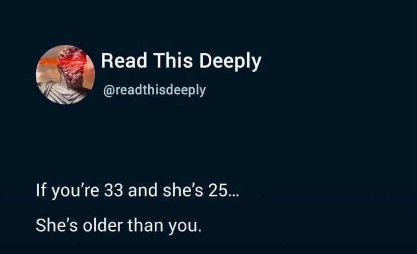 >>10305982 Мне 37, недавно на спортплощадке где я тренировался, рядом сидела толпа малолеток лет этак 16-ти, гадали мой возраст, и блять я вообще выпал с их вердикта. Итог, 20 летний парень. И такое регулярно. Не так давно зазнакомился с компанией тянок, ну плюс-минус моего возраста, с одной плотно разговорились, и что-то она всё про себя, да про мужа говорила, мол мы уже старые совсем. А когда прямо про возраст спросил, оказалось она с мужем 84 года, а когда я сказал свой, она вылупила глаза, от силы 25 давала. Такие дела. В принципе ок.