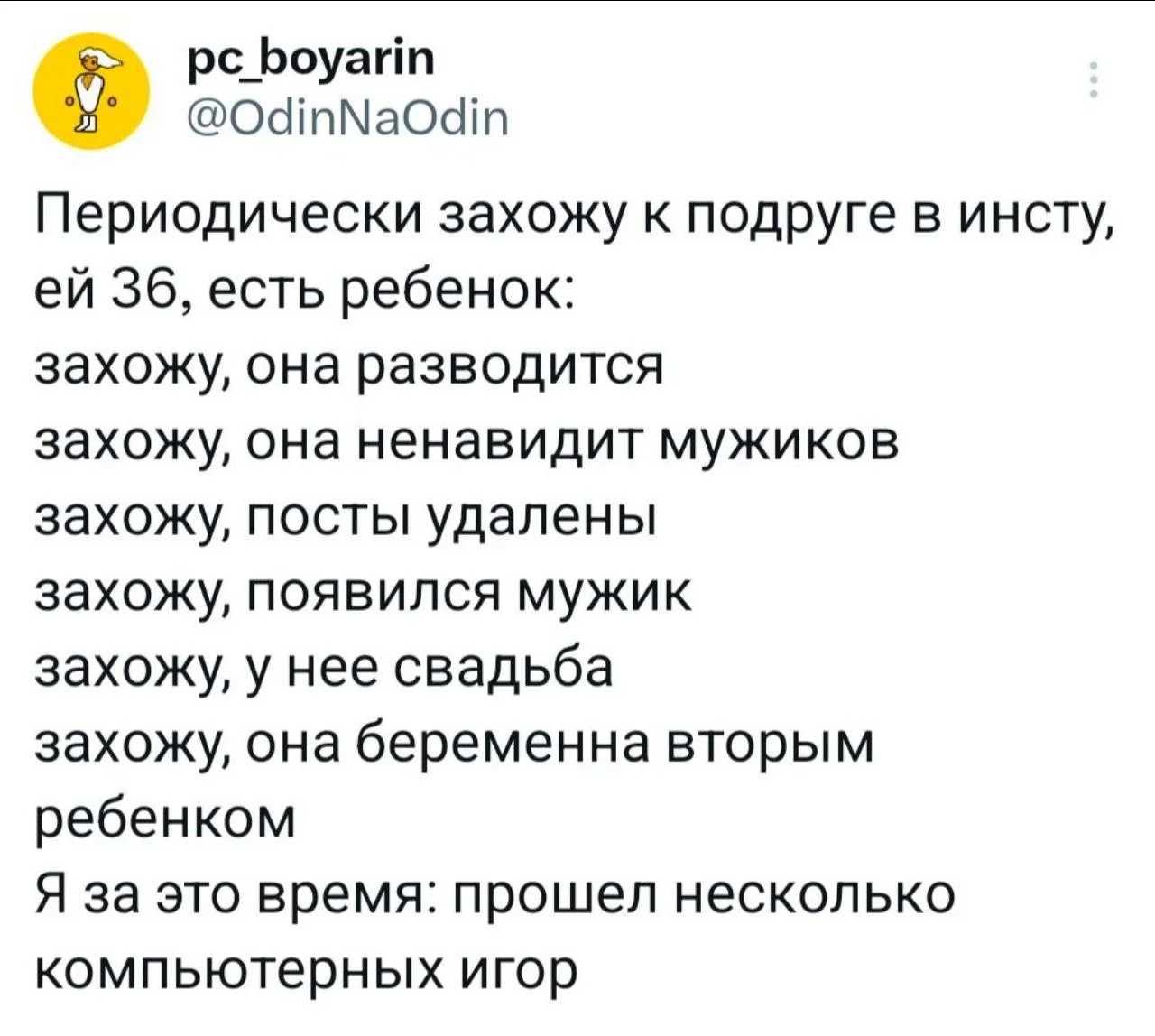 >Да и какие такие важные дела есть у среднестатистического анона, от которых могут отвлекать женщины лол? Любые епт, которые не связаны с любимым человеком. Работа, хобби, тусовки чисто в мужских компаниях, какие-то свои интересы. Да даже банально если ты хуйней маешься по жизни, поиграть в компик или поскроллить двач, когда лично тебе это нужно для поддержания душевного комфорта