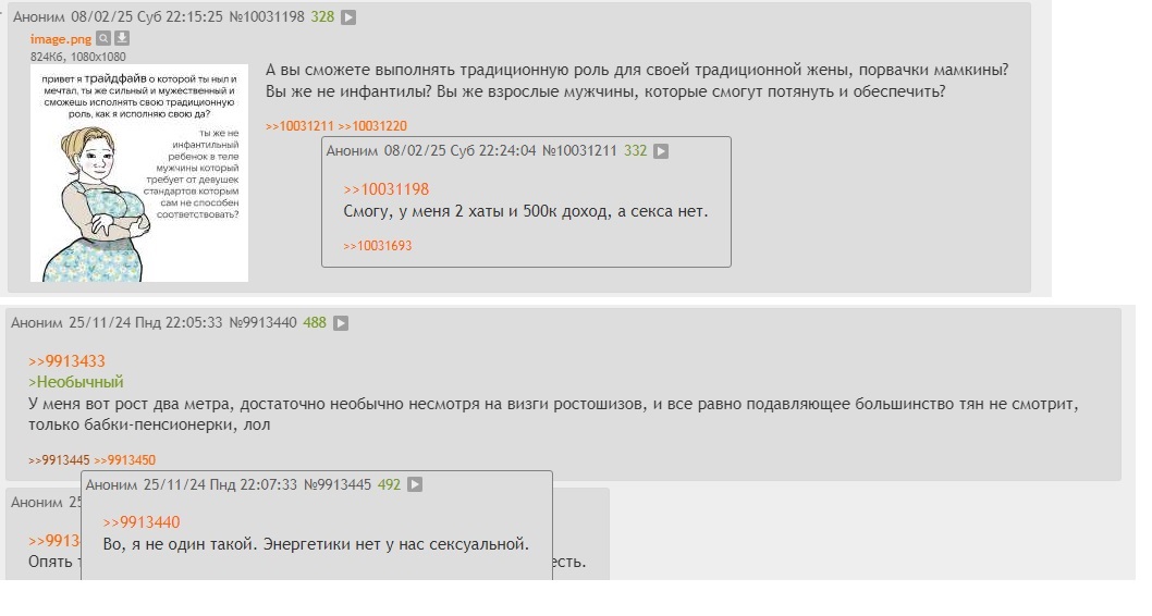 Я сам девственник, но как же вы меня бесите блять. Тупо вы посмешище борд. Раньше были битарды, девственники. Это считалось и проклятием, но при этом воспринималось с юмором. Сычик девственник Славка и тд и тп. Были и нытики конечно, но не на уровне инцелов сегодняшних. Сука. Тупо шизы, причем даже иной раз отвращение больше чем смеха. Тупо мерзость. Треды засраны, какая то борьба и обвинение женщин, называнием всех баборабами и попытки доказать что женщины это ЕБАТЬ зло, ведь они не светят.
