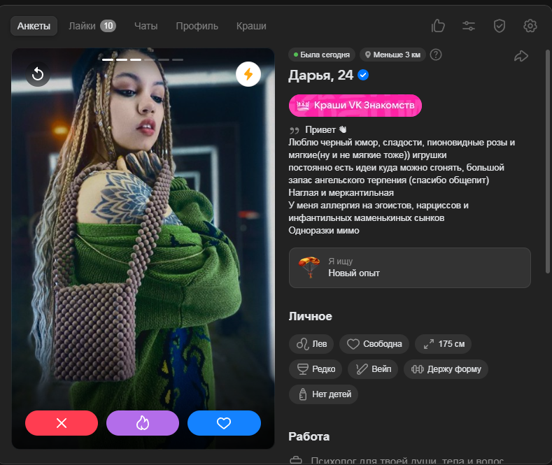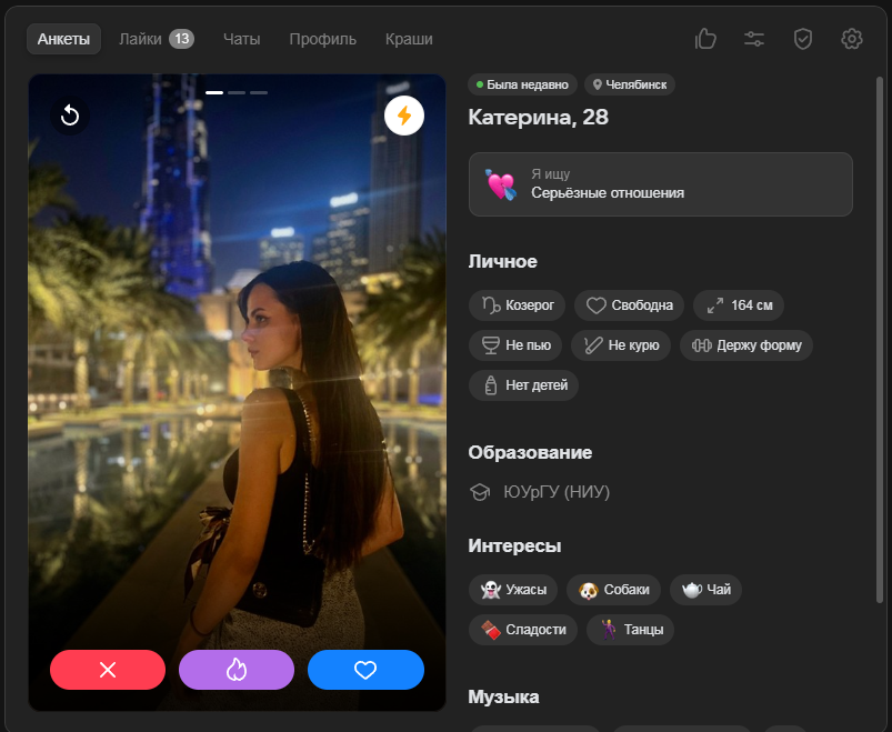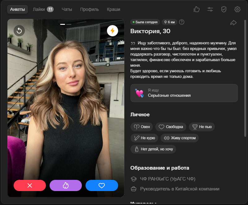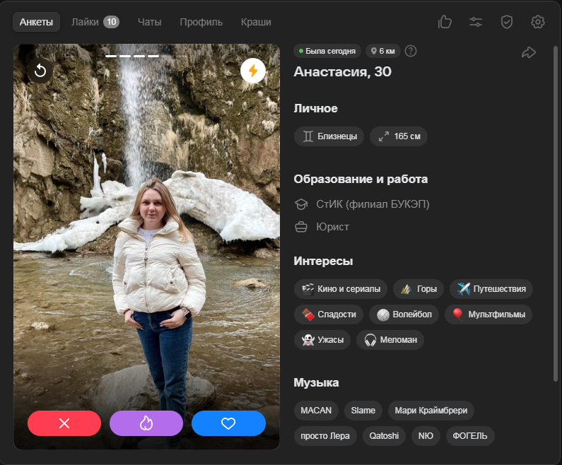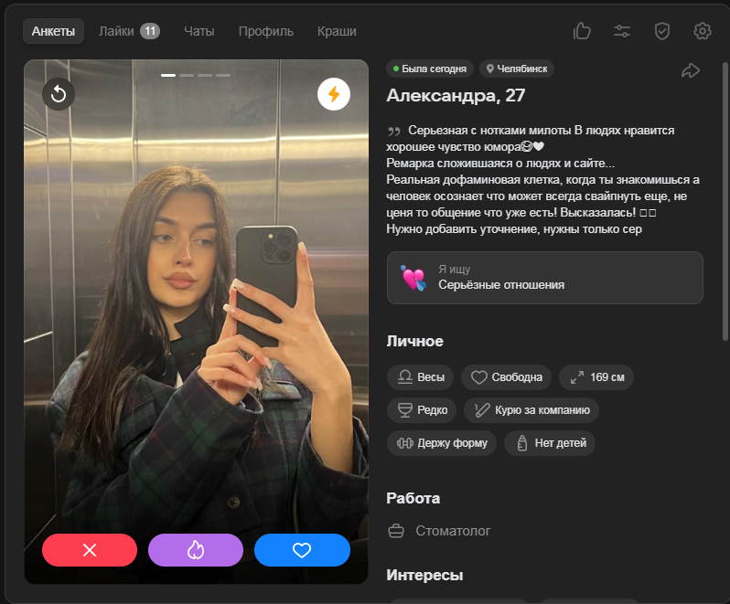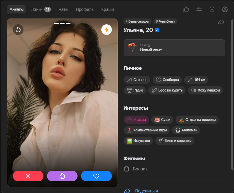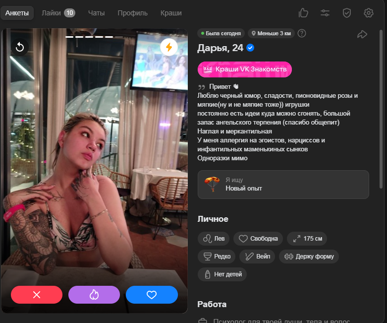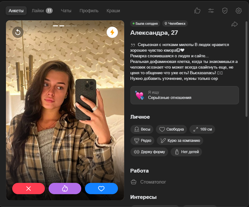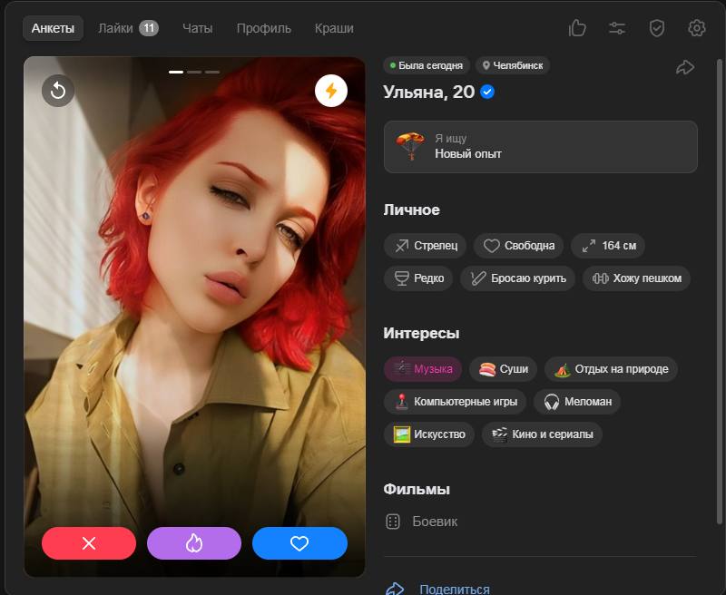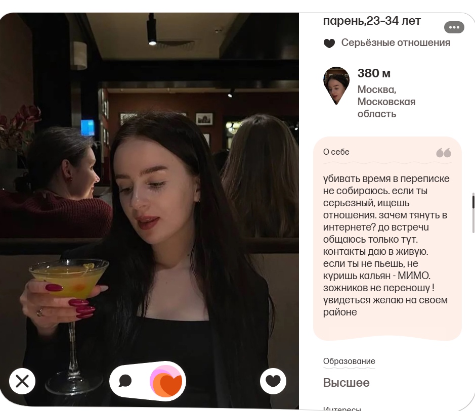Ну тут я выше уже писал, что норм анкеты там вполне себе есть, но взаимных лайков в разы меньше, чем 2-3 года назад было в тиндере и вкшном дайвинчике.