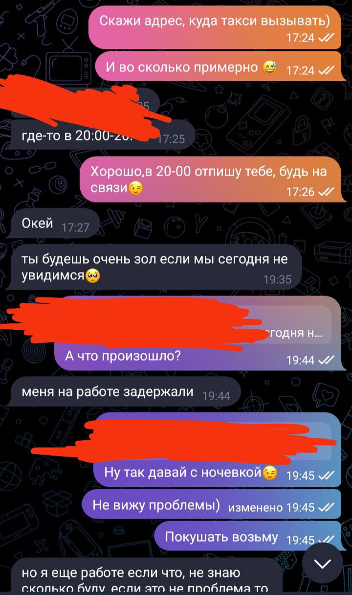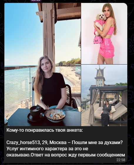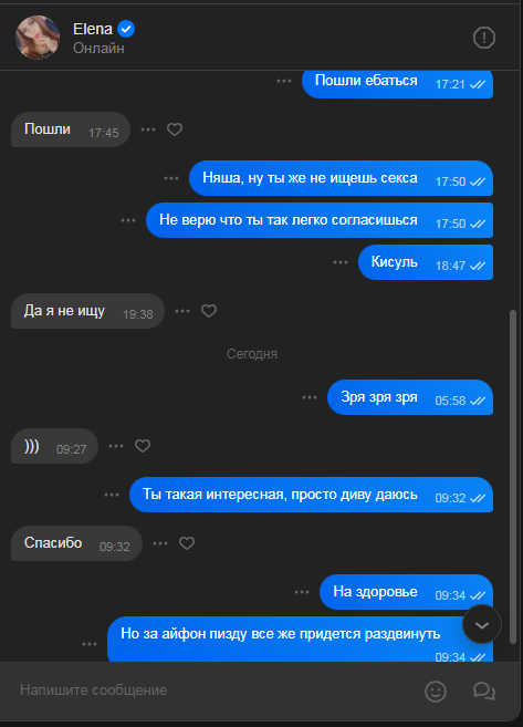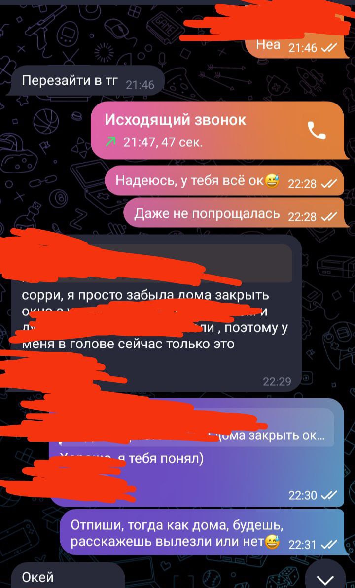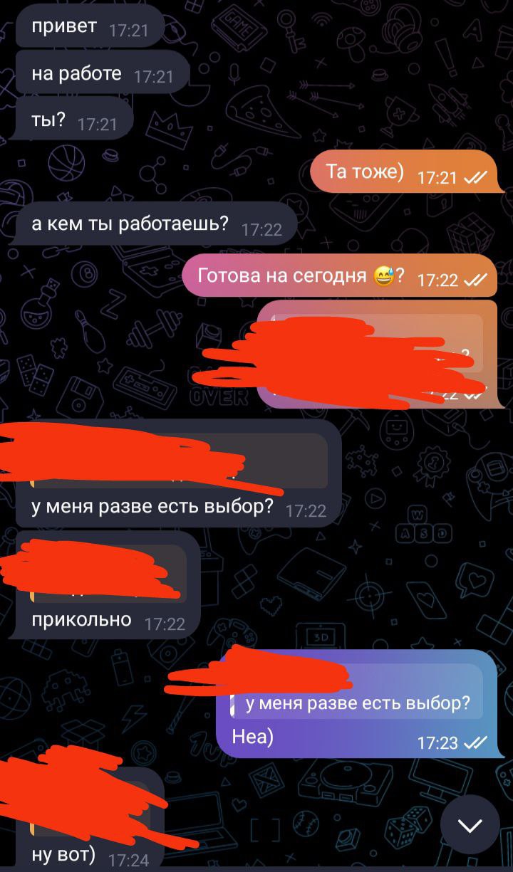5) Не соглашаться на предложения во что-то инвестировать или влошиться еще в какой-нибудь проект, обещающий чудесные доходы. Самый неприятный скам, поскольку перед этим тян может изображать активное и заинтересованное общение на протяжении нескольких дней, кидать кружочки и голосовухи, пока не войдет в доверие. Обычно они утверждают, что живут где-то за границей и не могут встретиться прямо сейчас, и очень быстро предлагают перенести общение с СЗ в мессенджеры. Подробнее - гуглить "pig butchering scam".