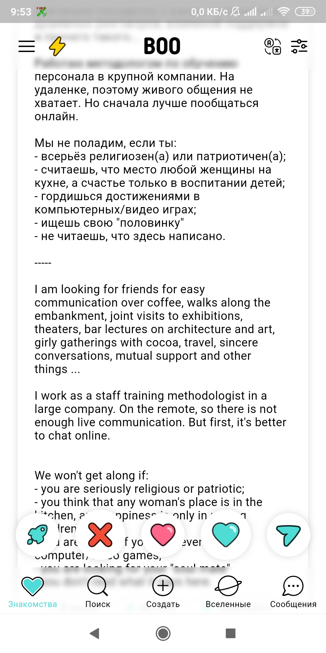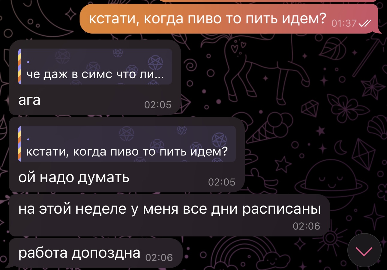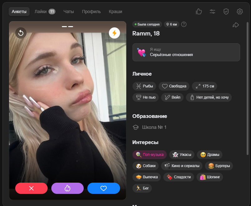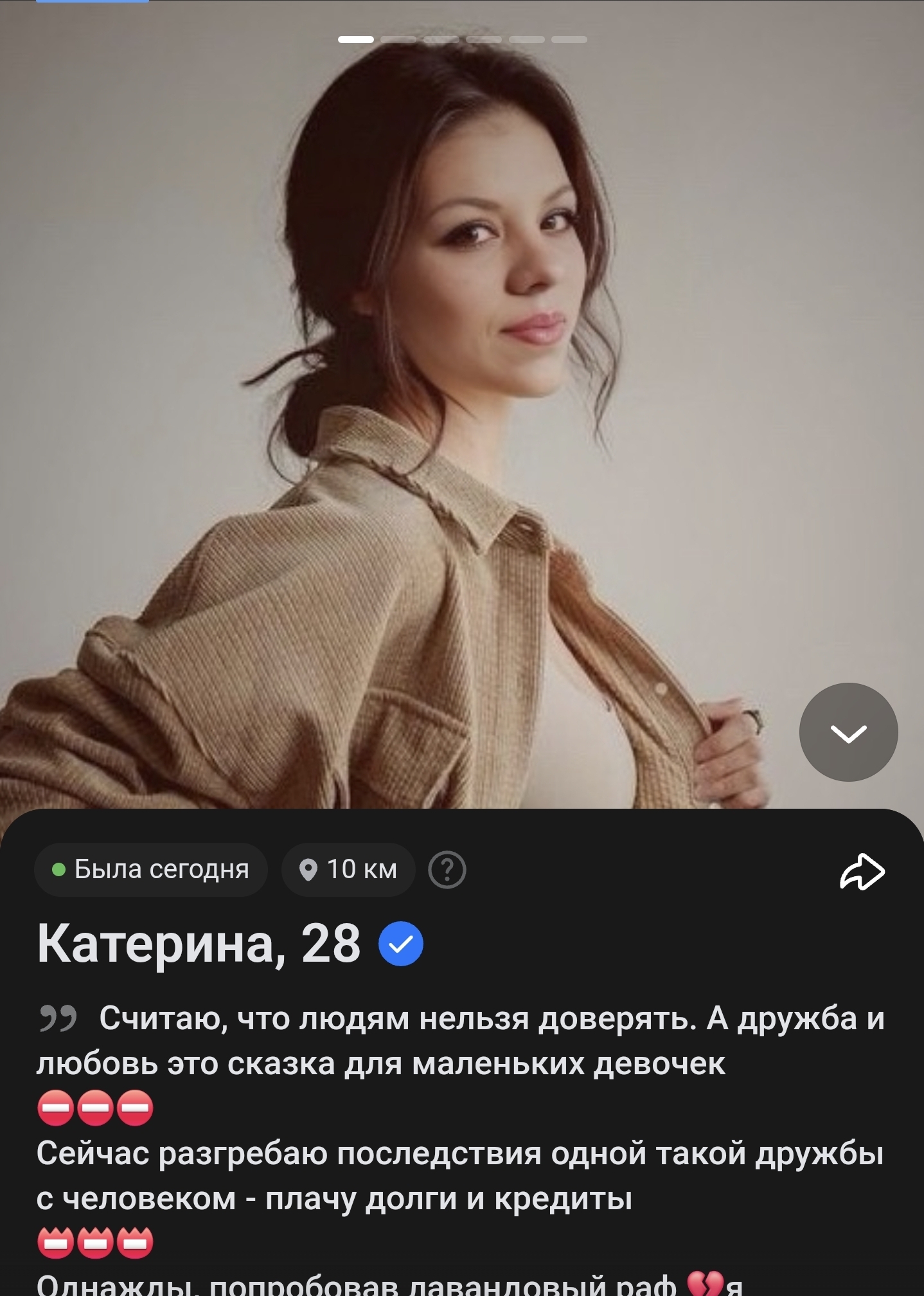 Нет, я видел ещё норм анкеты, такие, с которыми раньше у меня задавалось неплохое общение. Просто странно что ни единого лайка от них. Да и просто иногда лайки прилетали, хоть и от явных скаммных анкет, но всё же. А щас полный ноль! Значит теневой бан