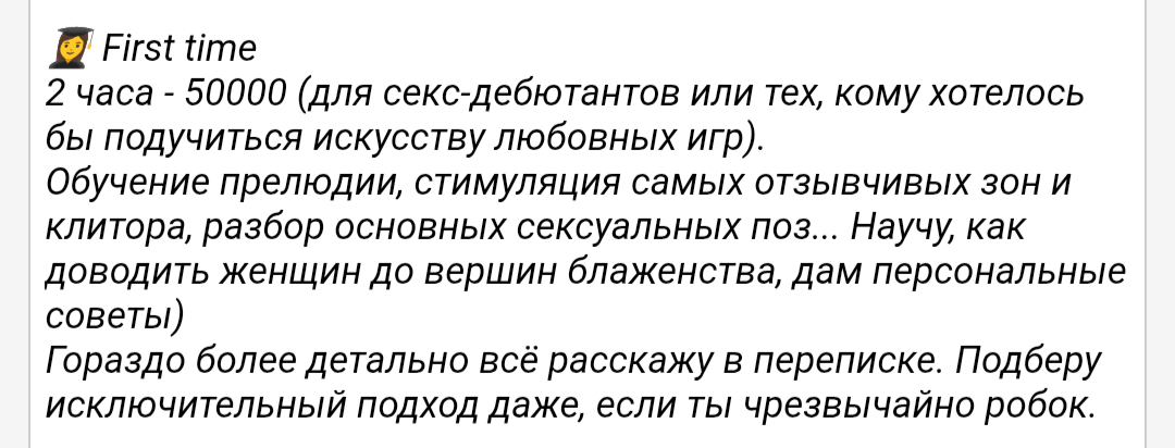 >>10320906 Нет в сфере 9/10, ну или от 70к часик. Ну да ладно, вдруг ты нашёл. Скорее всего будешь смущать и не встанет. Попрактикуйся сначала на узбечках, перед ними не стыдно.