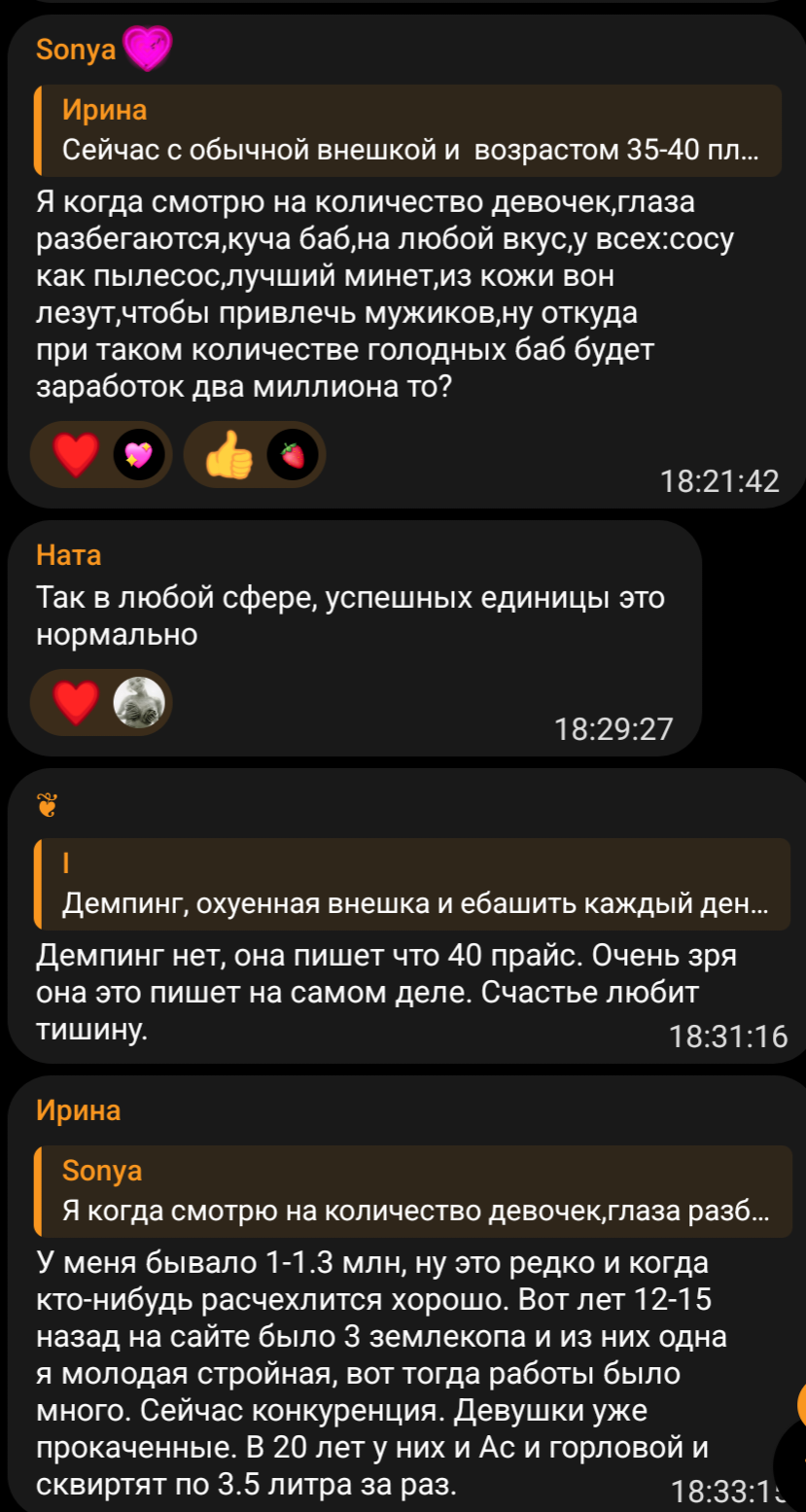 Я вообще не понимаю. Как эта шлюха каждый день работает. У нее анкеты 12 до 2 часов ночи. Когда она сказала что пашет с утра до ночи. Я думал угарает. Нет сука это реально часто слежу за ее анкетой. На чтотона копит то при прайсе 15к. Блать неужели у нее совсем все плохо. Если бы это просто диспа забыла выключить анкеты то давно бы ей забрали анкету. Мол динамо и тд. Но нет она реально работает. Зачем себя так мучить. Вроде бы деньги большие крутятся. На кой хуй
