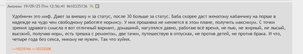 >>10335460 Ты дурак? Удобнича нужно понимать как – челик у которого есть недвижимость и не одна, машина и бабки. Ты не станешь удобным человеком, если твоя зарплата 100 000 и квартира от бабки. В таком случае ты будешь удобным для разведёнки. Но такой и наркоманы сгодятся.