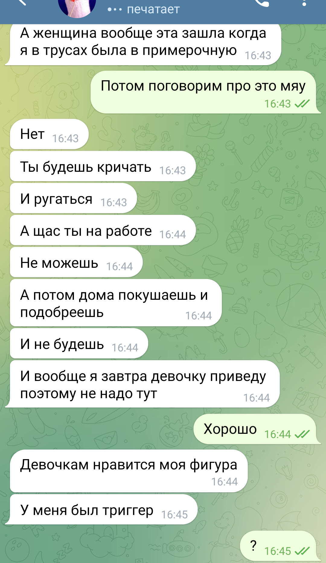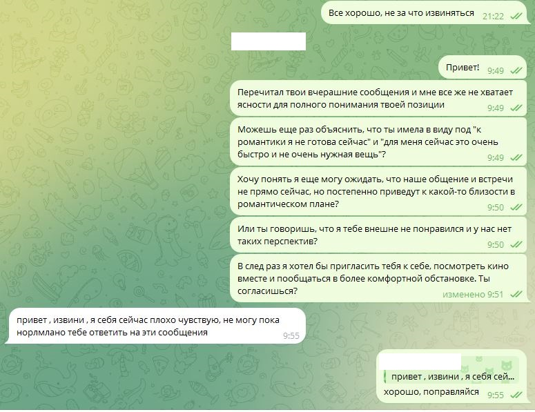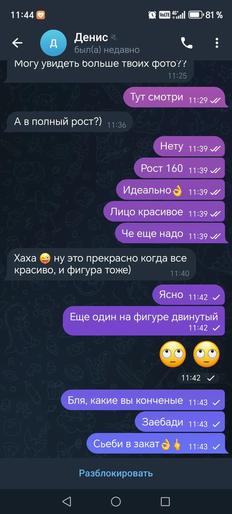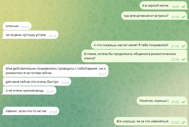 Никогда, слышишь? Никогда не занимайся такой хуетой в переписках с тянами. Если она еще может чет могла тебя проверять, может бы очухалась и захотела продолжить общение(что вряд ли, чувствую там свиданка была почти в духе этой переписки), то вот после такого твоего захода точно нет.