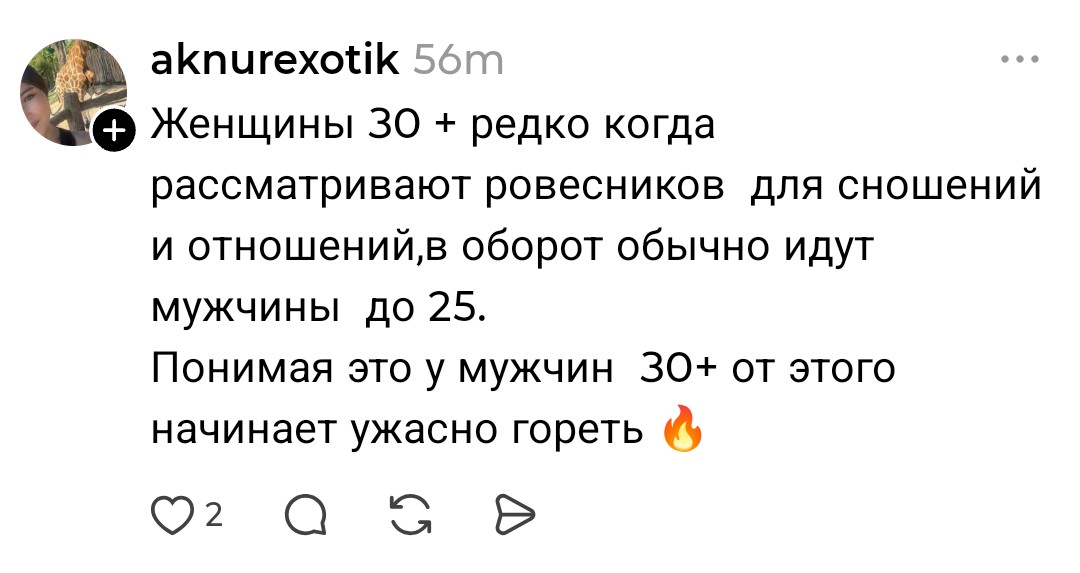 >«Я считаю, что проблема, о которой говорят демографы, — это проблема мужчин. Этот инфантилизм мужчин меня поражает. Я нормальных мужиков вижу в основном на СВО, остальные какие-то мамкины сюсюндры. Ходят в шортиках и мечтают о Playstation в 30 лет. Зачем всё это? Любая женщина хочет видеть рядом с собой надёжного мужика. А не какого-то похотливого самца, который по пятницам нажирается в баре и строит глазки какой-то кривоногой. Практически любая женщина хочет семью, а мужики начинают заигрываться, они маминькины сыночки».