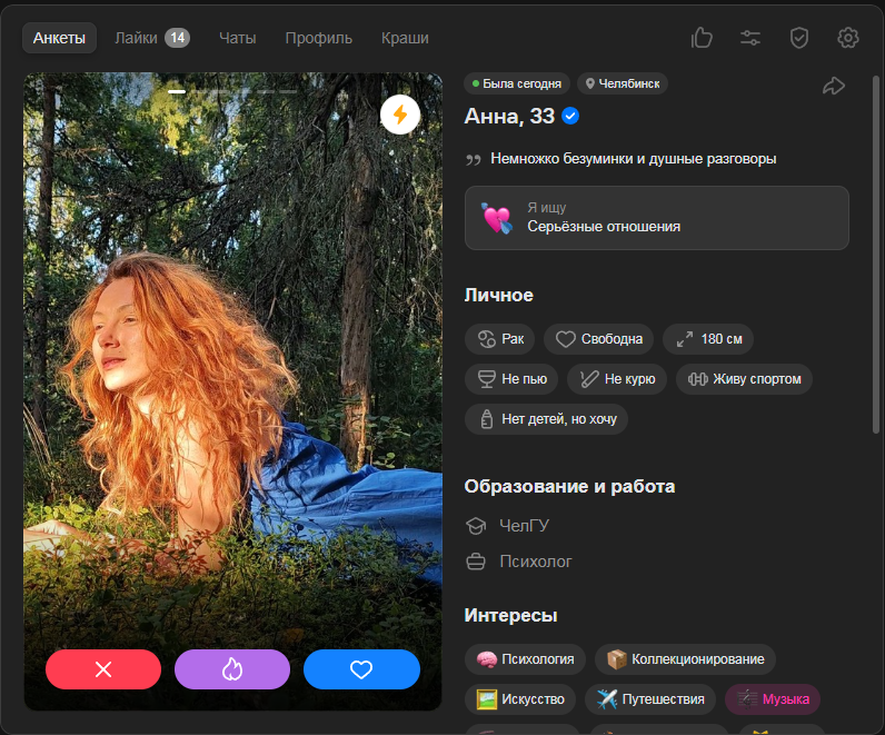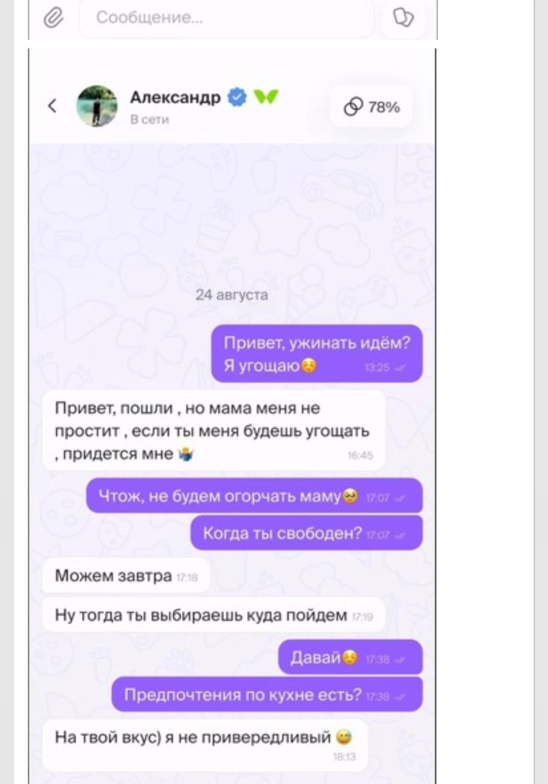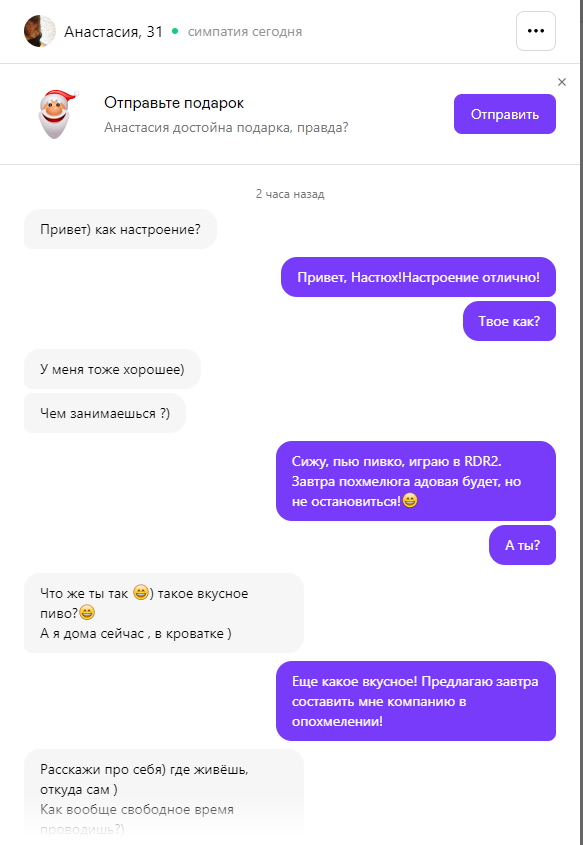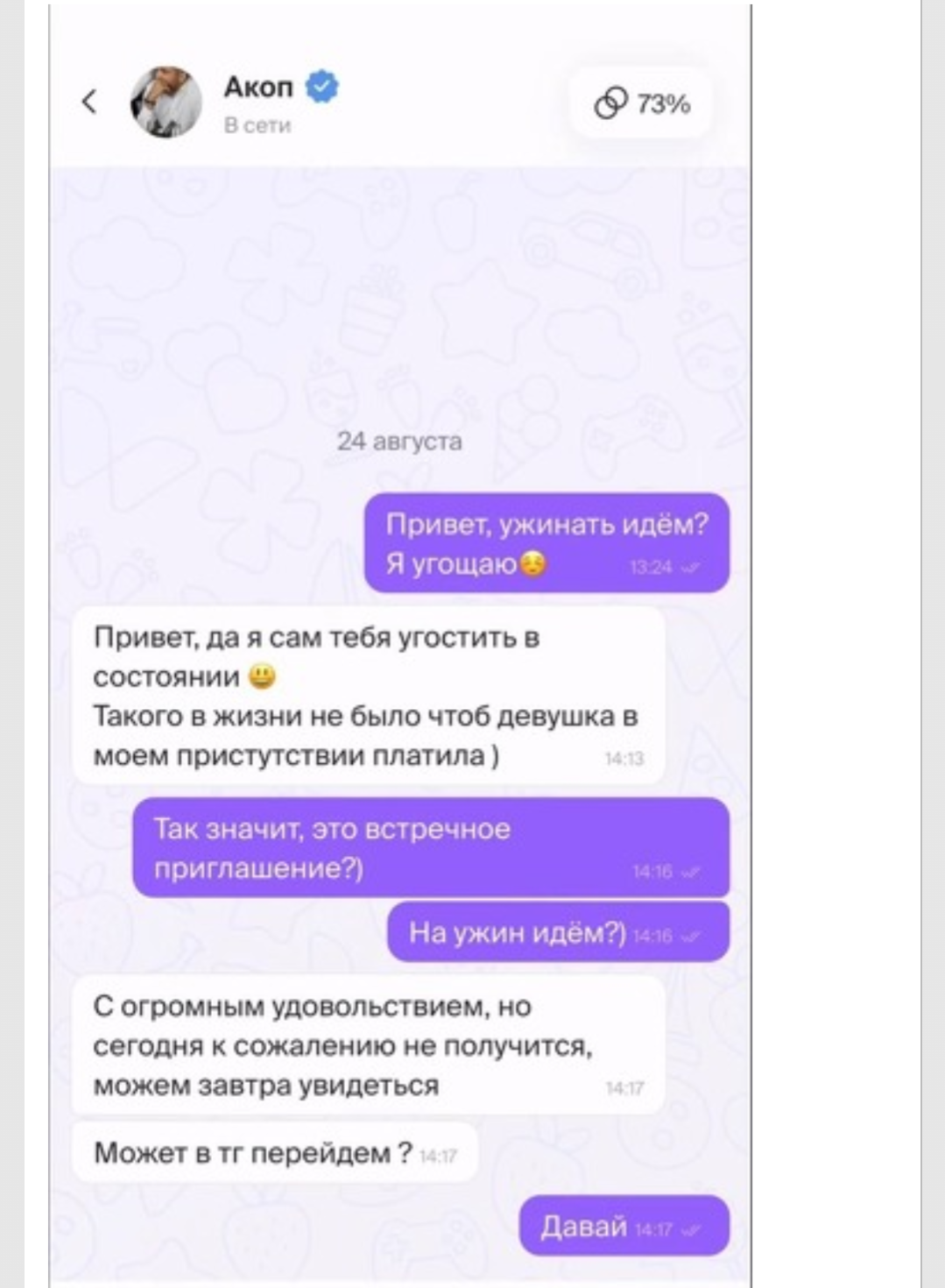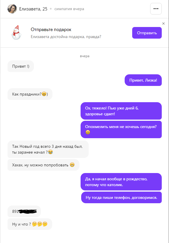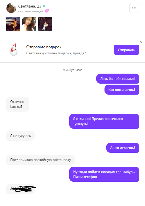Вкину своих старых скринов со свей реальной анкеты, чтоб на контрасте с переписками с фейка Татарина Зимой не помню какого года уже, пытался найти себе кого-нибудь, чтоб покататься на коньках. Так никакого не нашел за всю зиму. Написал 250 девушкам и женщинам, большая часть не ответила, а те немногие, что ответили не согласились