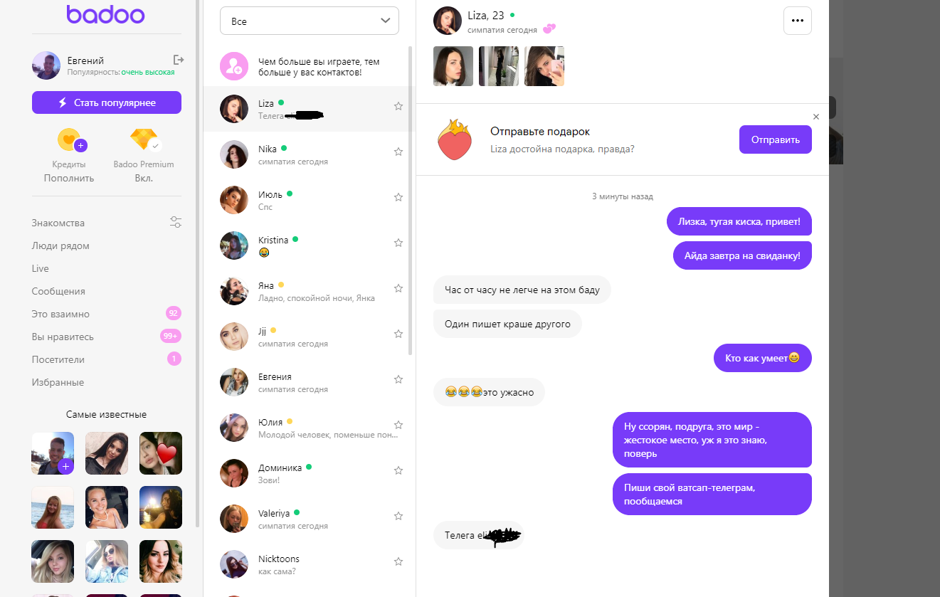 Ну зарегался я на СЗ (табор, мамба, дайвинчик), купил премиумы, что в итоге: - несколько ботов-разводил на которые я повёлся (в смысле общения) - лайки от тянок из дальних городов - наверно тоже фейки, хотя были и проверенные. - лайки от тянок с моего диапазона (~5км) - на мои сообщения не отвечали. - на мои сообщения некоторые отвечали, но только те кто подальше от меня и без тесного общения. Видел там знакомых-знакомых тянок (30+лвл), ну как сказать - залежалый товар, наверно тараканов больше, чем у меня. подДСье.