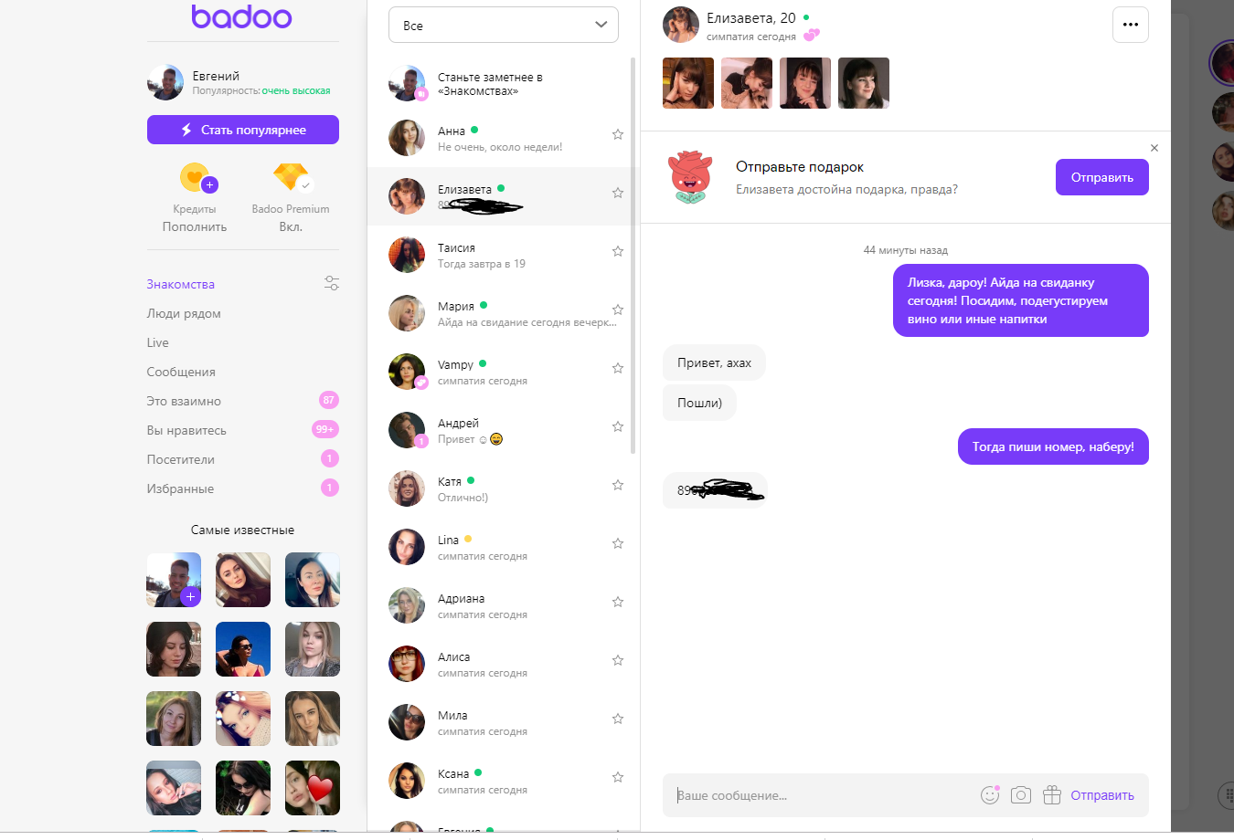 >>10334223 >вытащил Без успеха? Я даже не представляю как вытаскивать, ибо могу наверно только провести диалог-опрос и позвать куда-то. А тянки да, торчат одни и теже, ЕОТ +8лет себе накрутила зачем-то, мб конечно фейк, но анкета обновляется, онлайн свежий.