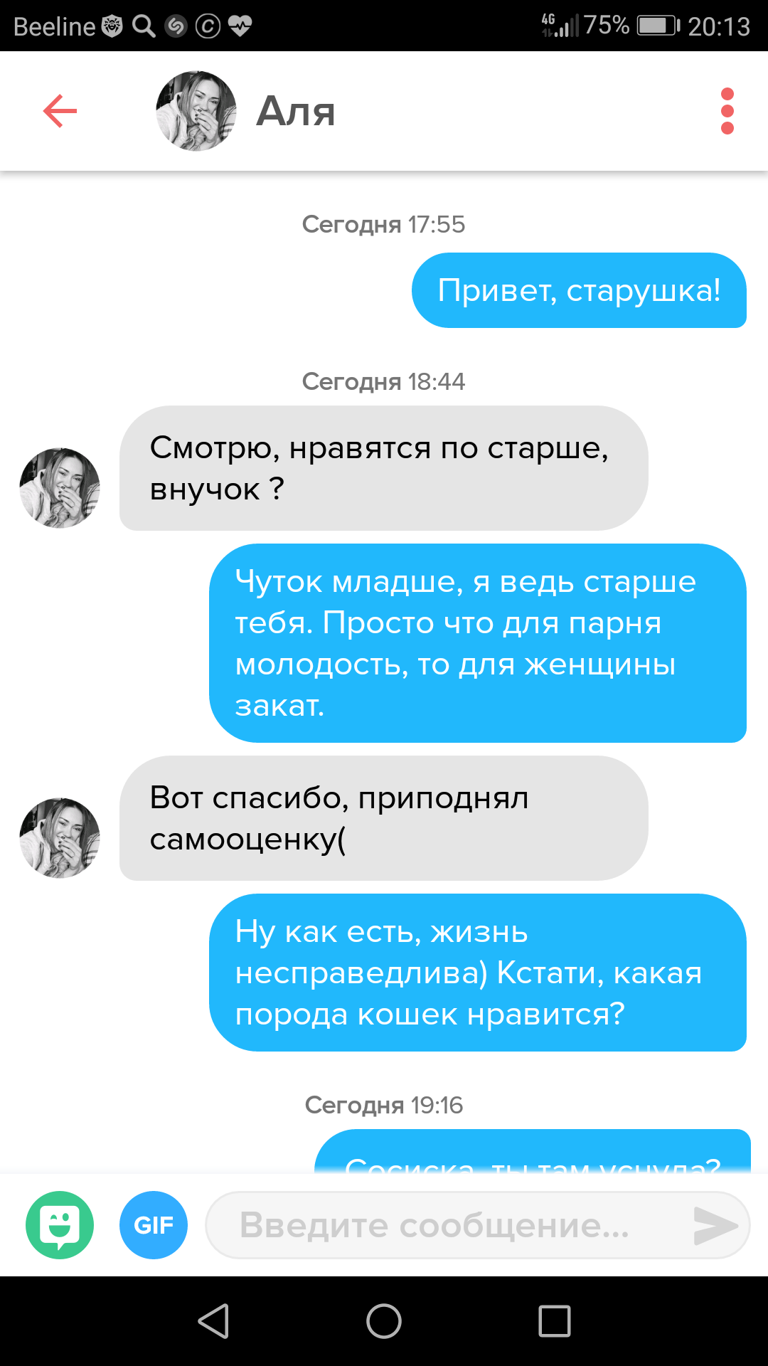 А если тебя душат события в жизни другого человека, то зачем с ним близком общаться? Если нет возможности поддерживать с человеком долгий диалог, то что изменится-то на личной встрече? Я искала общения, он тоже, и мы эту потребность друг друга удовлетворяли. А потом уже встреча, гормоны и последующие события в виде отношачей. Или ты думаешь, что если душат разговоры в переписке, то в жизни это окажется совершенно другой человек? Вообще не факт.