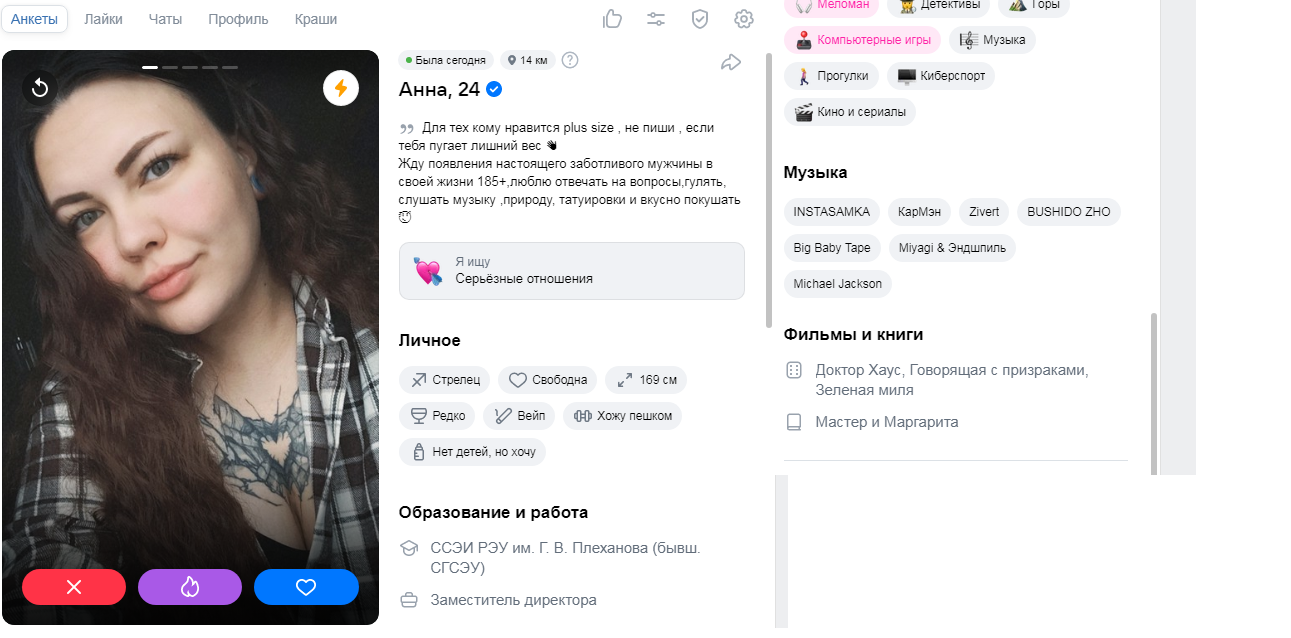 Нашёл тянку 20лвл в 1 радиусе 500метров, даже фотки есть из города, написал ей - игнор. Вот уже вторая неделя прошла, диалог пропал уже (мамба). Ищет "друга" до 24лвл, мне 30, занимается косплеями всякими и в игоры играет. Как бы её зацепить? Засталкерить неудалось.