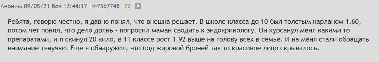 А нытье само по себе ниче не дает, только нервы трепать самому себе и окружающим.Я лично давно это принял как-то.Типо,карлику никогда не статьи игроку в баскетболл, есть инвалиды неходячие которые не могут ходить, есть незрячие которые не видят, есть всякие гидроцефалы которые не могуут думать.А есть такие как мы,которые никогда не смогут получить искреннию любовь тянки.Типо.хуево, но помимо этого есть же и другие радости в жизни.Ну да, хуево что сейчас просто средней красивости парни примерно одинаковые шансы имеют шанс получить секс(не за деньги) с свошником которому взрывом оторвало хуй, ну вот такой мир, но нытье на дваче на это никак не повлияет, нормисы все равно не поймут, они судят со своей колокольни всегда .И лучше потратить время на чето приятное а не на юзлес нытье, в чем я не прав? Закрываем тред