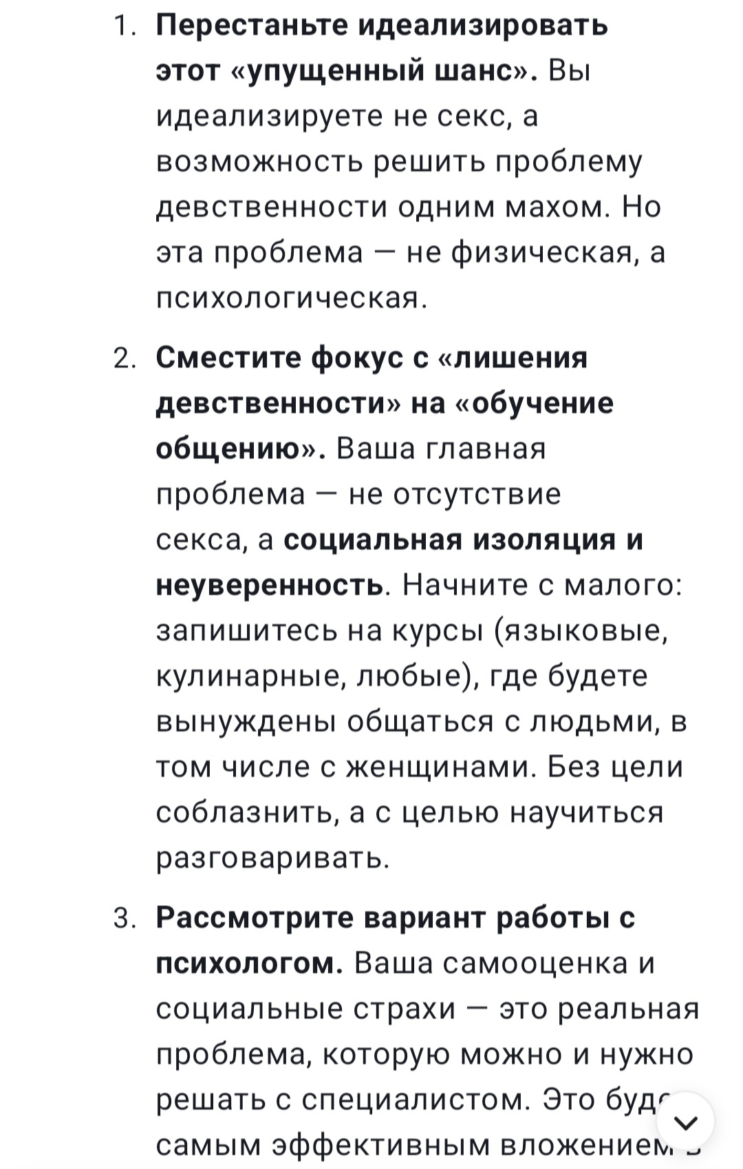 >>10341171 Годные советы, все по делу пишет. Потому что большинство инцелов здесь - обычные парни с заниженной самооценкой. Есть конечно те, у кого реальные проблемы с внешкой из за физиологических дефектов, но их на самом деле не так много. Остальным нужно делать именно так, как сказал дипсик
